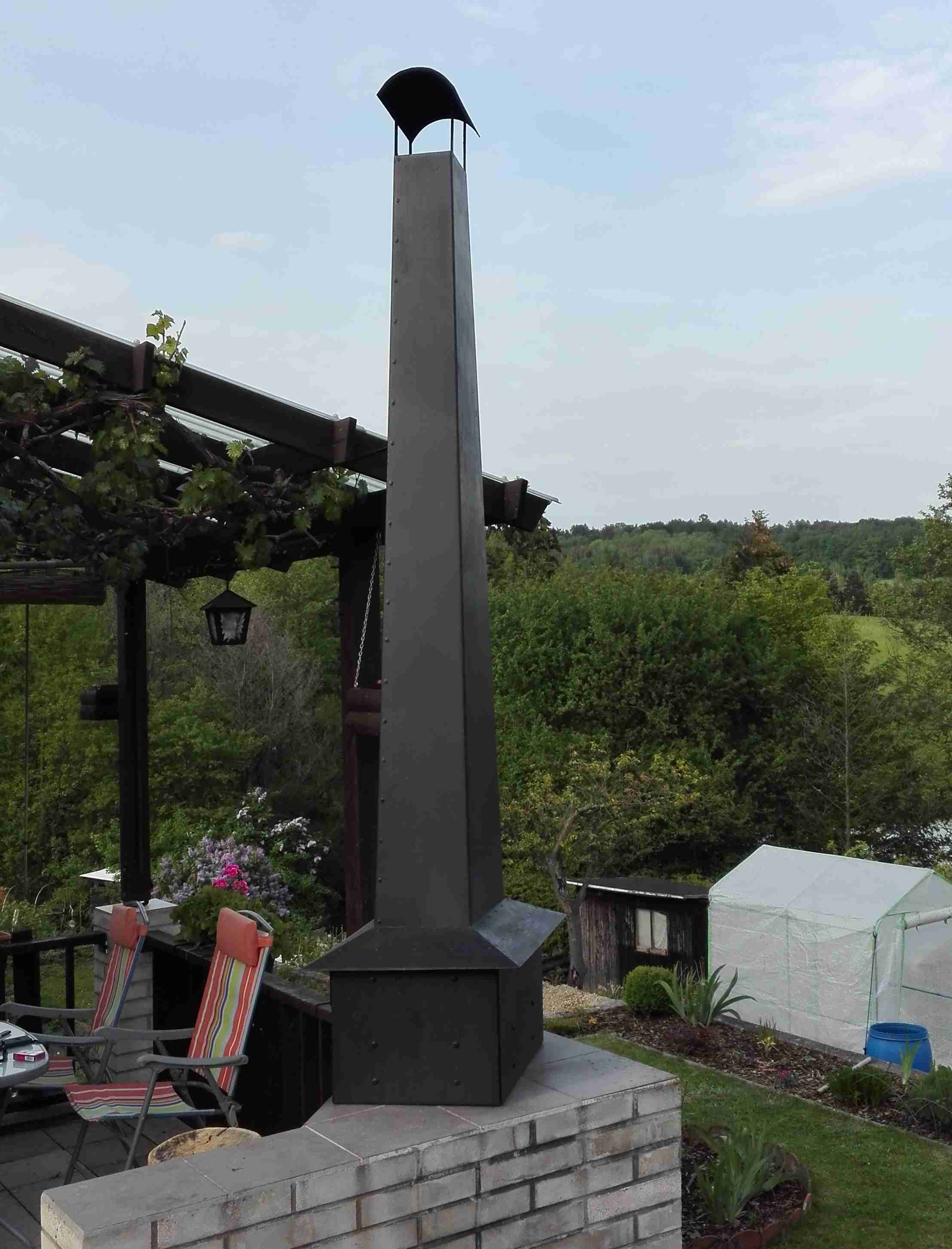 Dávám fotky mého krbu. Původní byl z 1 mm silného obyčejného plechu, vydržel deset let. Tento nový je z jedenapůlky, topeniště je vyloženo 2 cm šamotovými plátky, takhle vypadá třetí sezonu. Oheň tam hoří pořádný, máme hafo palivového dřeva. Kdyby byl zájem, mám plánky jednotlivých dílů krbu, včetně nástřihového plánku. Na krb padla jeden a půl tabule plechu, celý je snýtovaný trhacími nýty (nemám možnost svařování). Výška je 240 cm, ale kvůli střeše pergoly, jinak může být menší.