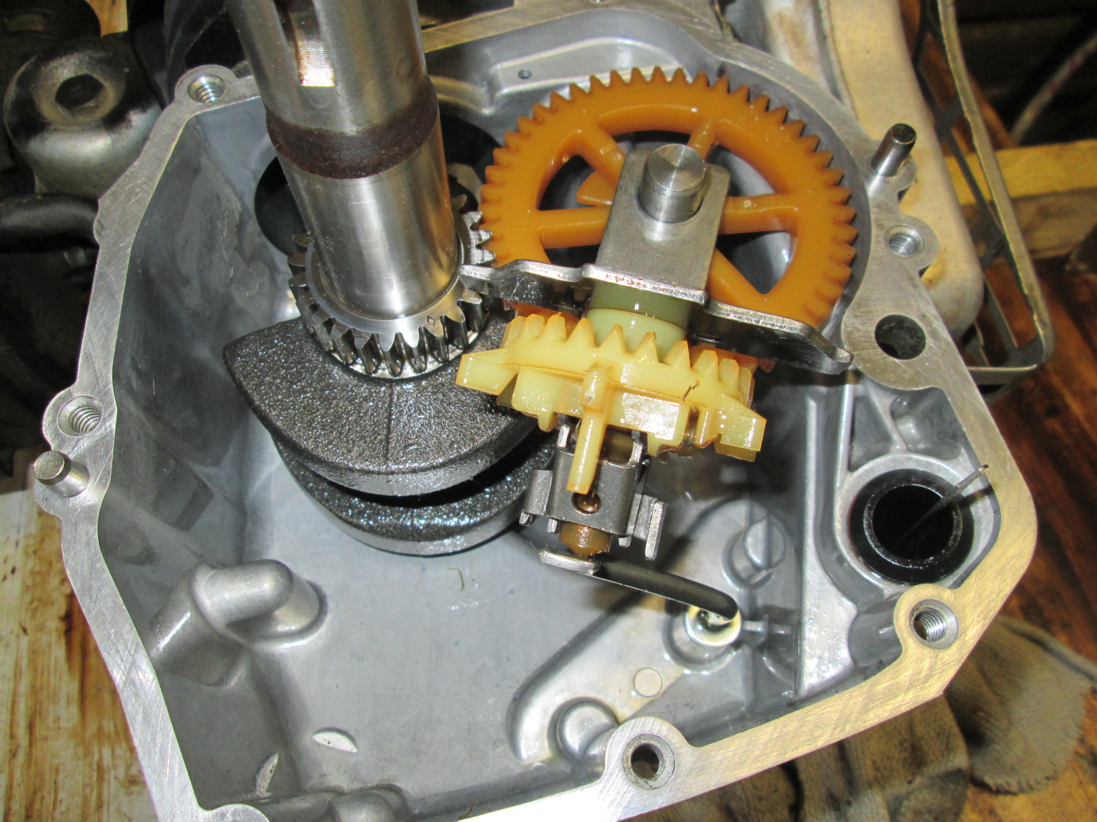 Dobrý den,dle mého názoru se musí ozubená část čerpadla nasměrovat tak do hnacího ozubu,aby křidélka na ní míjela při otáčení závaží na klikovém hřídeli.Prostě zkusmo nastavit,několikráte otočit,aby se to nepotkalo a tak to nechat a zadeklovat.Možná se pletu,podle fotek to prostě vidím těsné,možná je tam místa dost a na nastavení nezáleží.