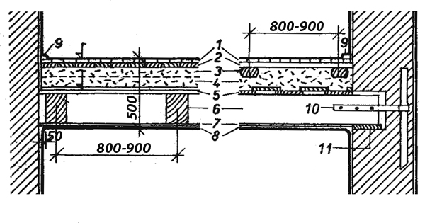 Betonová vrstva byla velmi tlustá. Po rozbourání betonové podlahy a vytrhání prken, jsem odkryl část násypu, až na bednění, zjistil jsem že prkna v části pod bývalou vanou jsou shnilá. Podlaha není moc pevná, pokud si v místnosti dupnu cítím nepříjemné vlnění. Jedná se o klasický starý trámový strop viz obrázek 01.