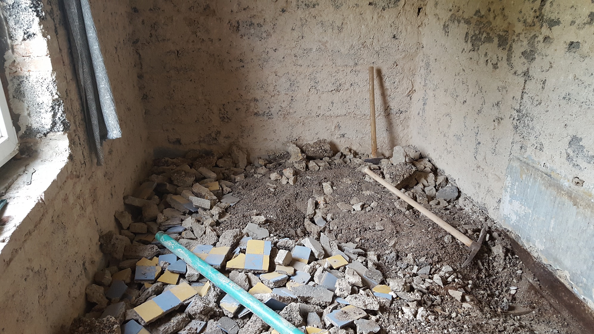 Po odstranění sutin provedu sondy, abych zjistil stav trámů (doufám že nebudou shnilé), jejich velikost a vzdálenosti.