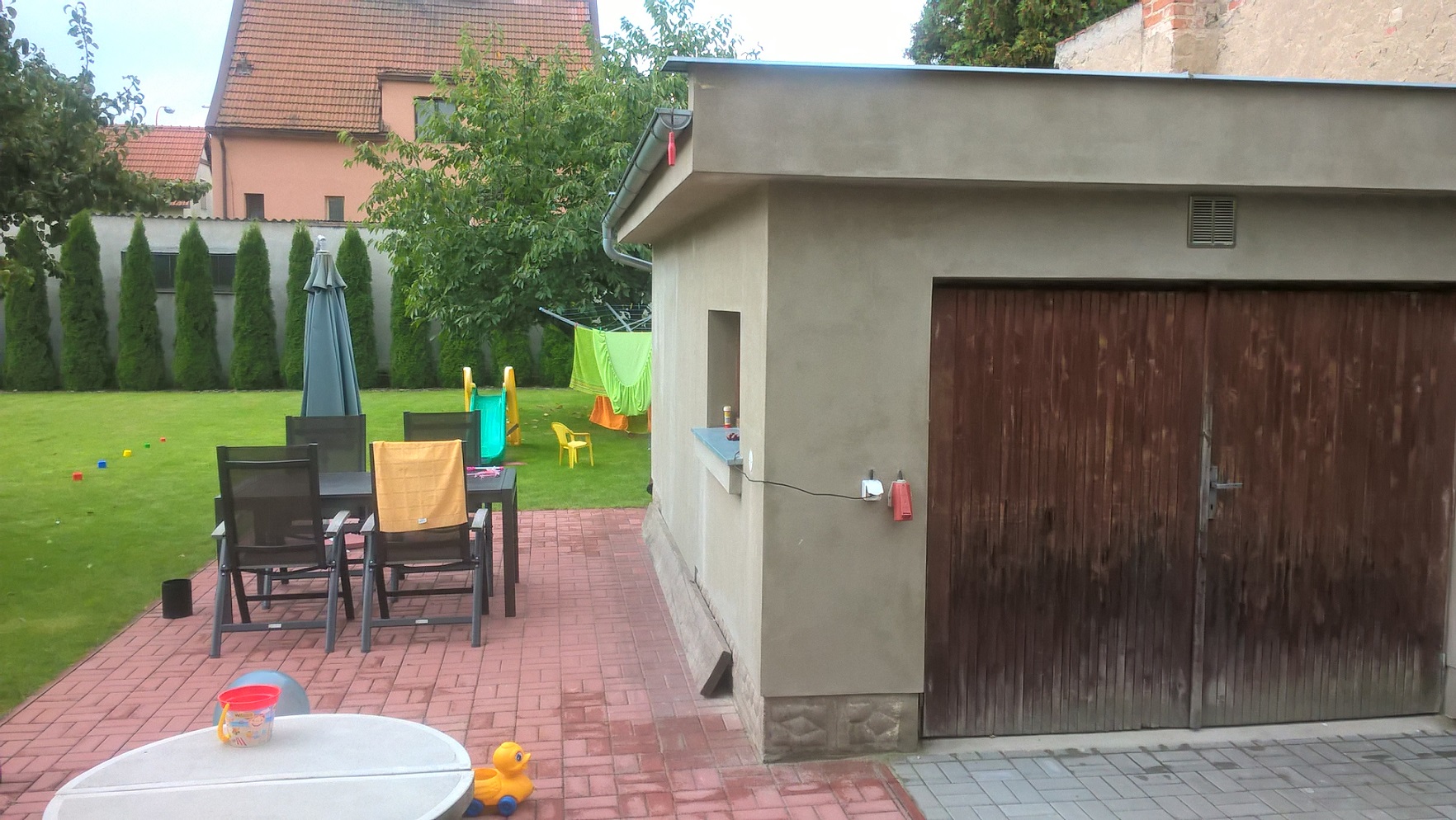 Rozhodl jsem se přistavět ke garáži pergolu s dutinkových panelů, ale zasekl jsem se na ukotvení pergoly ke garáži. Nevím k čemu ji ukotvit. Na druhé straně mám už vybudované pozinkované patky (schovány pod černou trubkou)