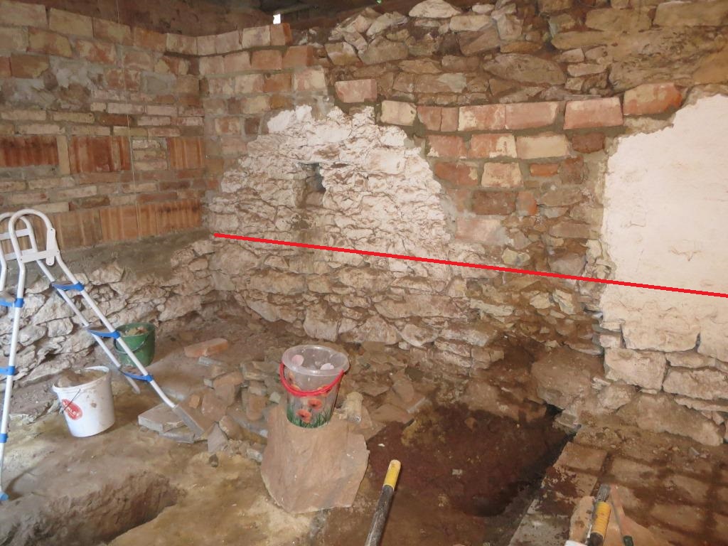Udělal jsem menší díru do podlahy a bohužel se v ní už asi 4 dny drží voda (obr. B). Z druhé strany zdi (obr. A) je hlína zhruba po tu červenou čáru. Posledních pár dní trochu pršelo, tak nevím jestli to jen neprotéká z té druhé strany, každopádně se mi to jeví jako dost velký problém, který nevím jak nejlépe vyřešit. Nějaké nápady?