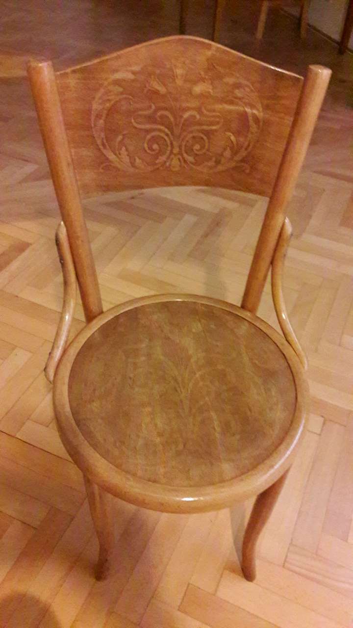 V příloze jsou fotky již zrenovované židle s původním sedákem, nový nevyříznutý sedák. Dál je nafocený kulatý rám sedáku s lemem a jeho detaily.