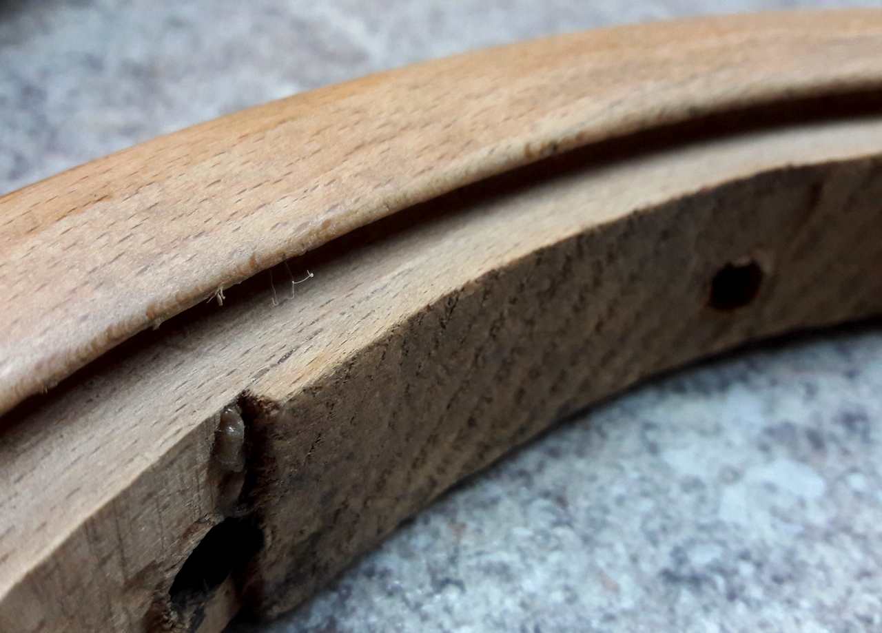 pustil jsem se do renovace dřevěných židlí. K dokončení zbývajících židlí potřebuji vložit nové sedáky do kruhového rámu se zapuštěným "lem", který je hluboký 4-6mm. Ohýbaný rám sedáku je slepený a zajištěný kolíčky, které jsem již vyťuknul. Předpokládal jsem, že po vyndání kolíčků, se mi podaří slepovaný rám sedáku rozlepit, ale nepodařilo.