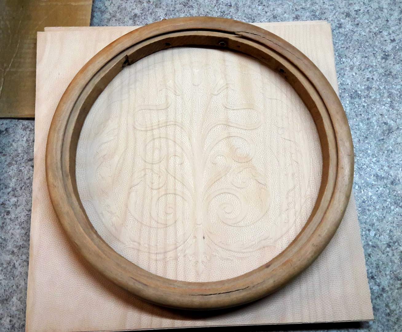 V příloze jsou fotky již zrenovované židle s původním sedákem, nový nevyříznutý sedák. Dál je nafocený kulatý rám sedáku s lemem a jeho detaily.
