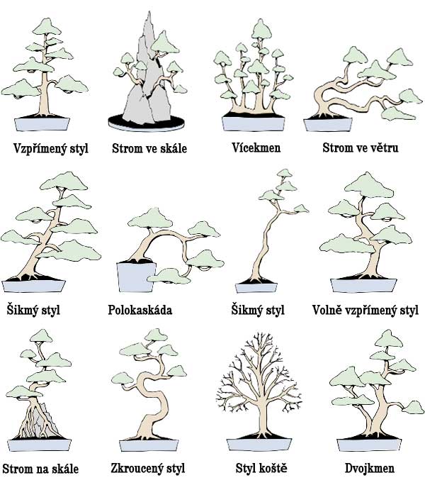 Bonsajové styly máš na obrázku. Stačí si jen vybrat a podle toho pěstovat. Pokud budeš chtít další rady, tak se podívej sem, určitě ti někdo poradí www.bonsai-greenhorn.cz