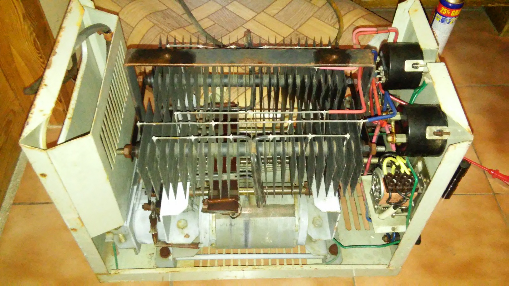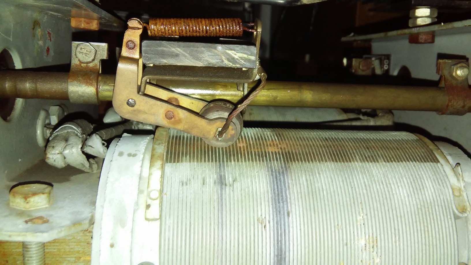 Rychle jsem ovšem vychladl, protože nešlo otáčet šnekem, který má posunovat soustrojím s dvěma uhlíkovými "korály" po obnaženém vinutí trafa a tím měnit výstupní napětí. Šnekové soustrojí bylo totálně zatuhlé, ani dvě hodiny přesvědčování pomocí WD40 mu nedomluvilo, nakonec jsem použil hrubou sílu na osu pomocí sykovek, a to pomohlo - sláva, už můžu měnit výstupní napětí!