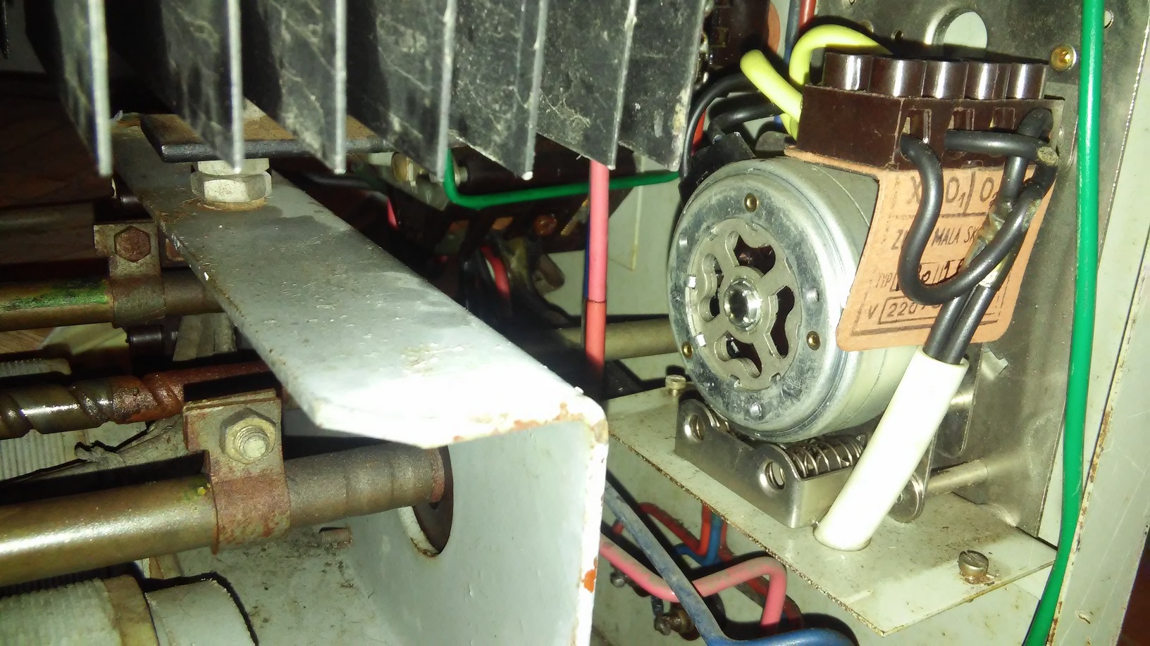 Pak bych motorek zkusil rozpohybovat, jenom asi nepoužiju sikovky jako minule, protože jsou tam všude kolem taková tenoučká hodinová kolečka a pružinky jako v budíku, celková kovařina toho stroje končí pod krytem časového spínače.