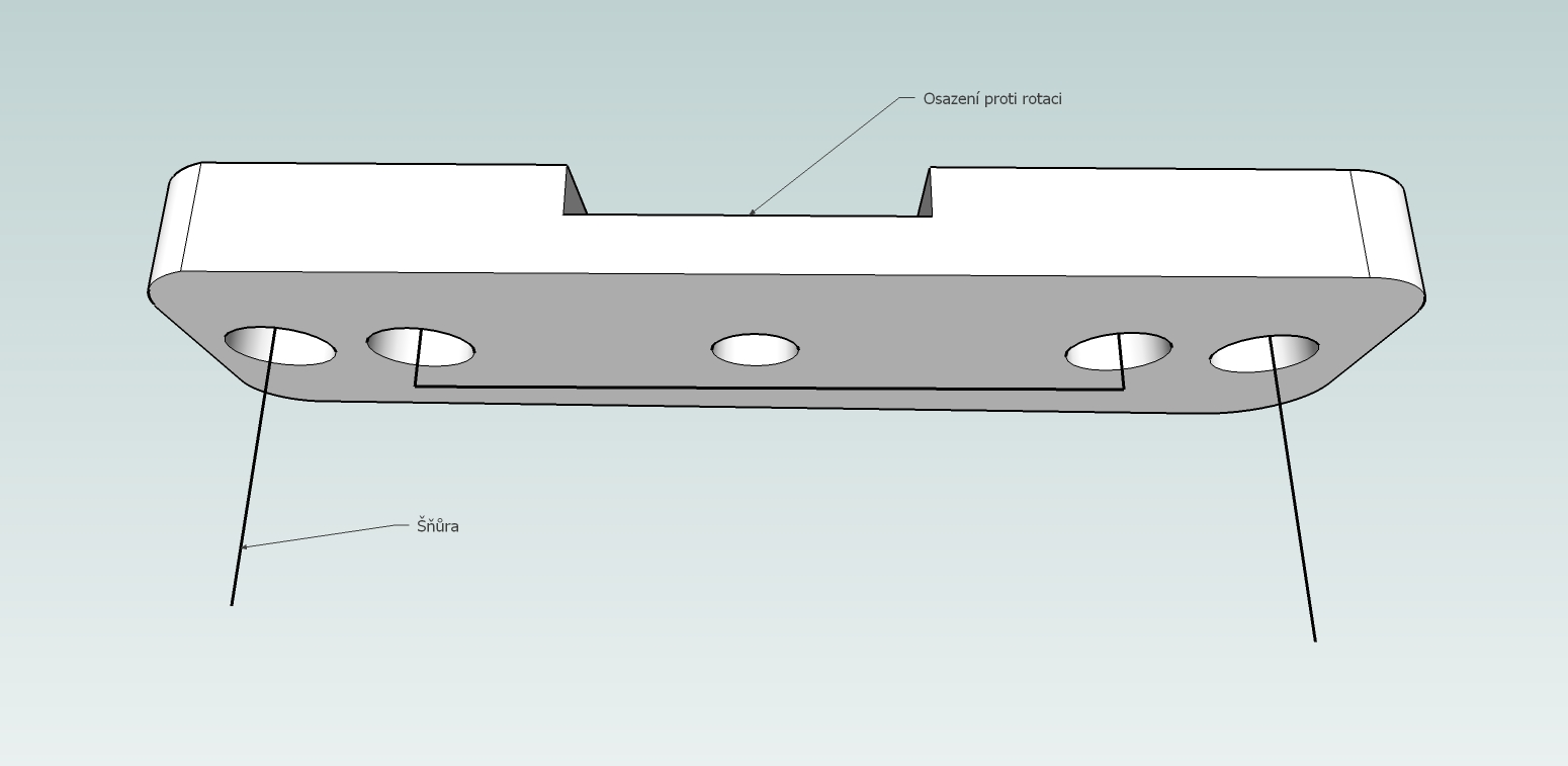 Třmen s třemi otvory. Prostřední k uchycení k jezdci. Krajní pro šňůru.