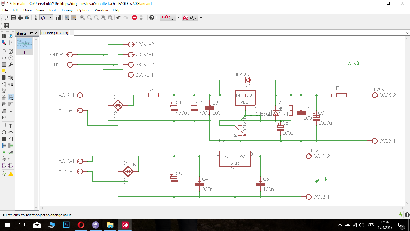 Přesně jak přede mnou psal Karel, na silové vedení použít polygony. Na DPS jich klidně můžeš mít více. Navíc silové cesty se kreslí jako první a zbytek, ten "méně důležitý" až nakonec. Síla cest se volí podle signálu, který jimi bude protékat. Proč v té silové části napájecího zdroje používáš 4 diody, když můžeš použít jeden usměrňovací můstek ?