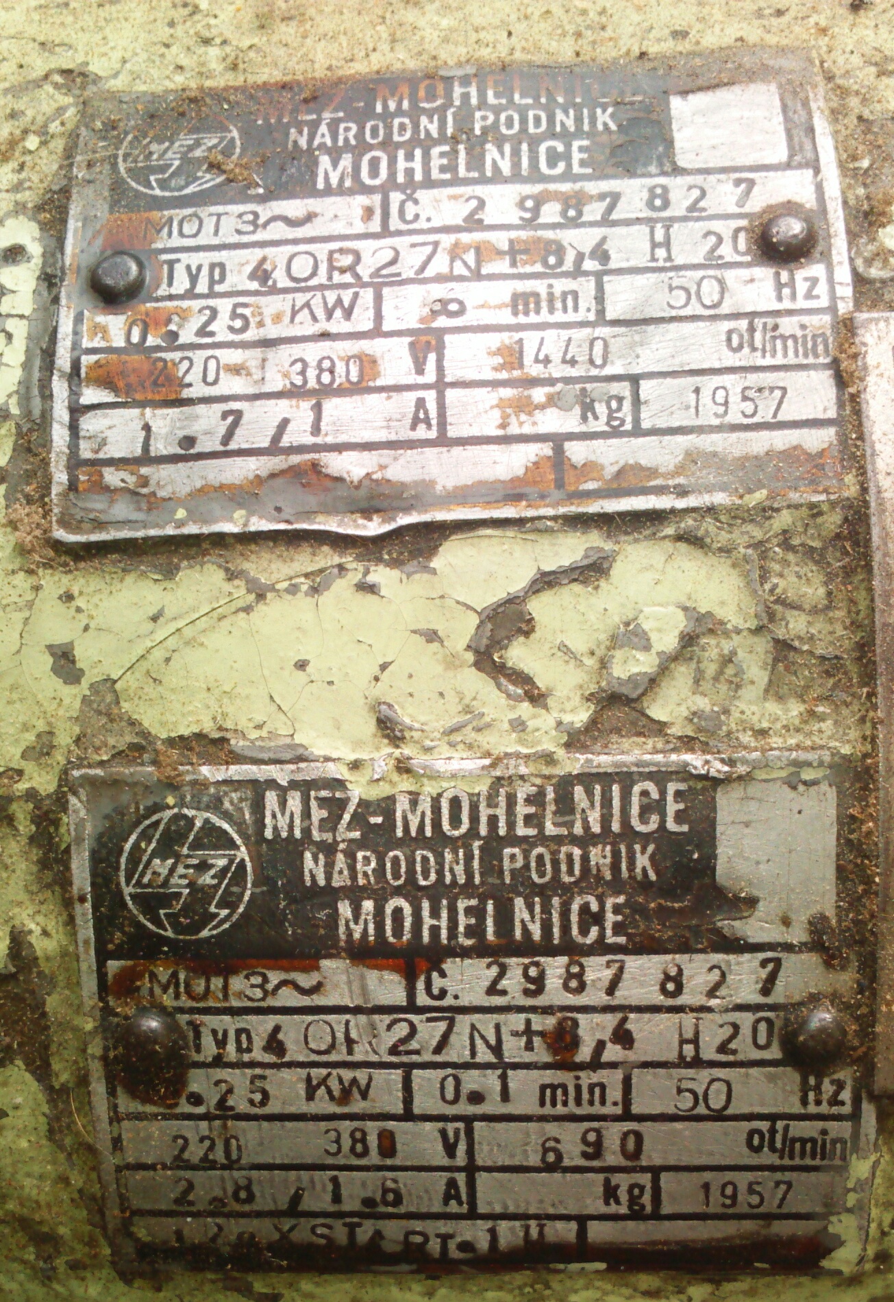 Nikto ti nepovie, k čomu slúžil ten motor. Štítok sa líši ešte údajom o dobe, po ktorú môže fungovať. Teda pri 1440 ot. za minútu môže byť trvale zaťažený (môžeš tam vidieť znak nekonečna). Pri tých menších otáčkach čo sú na druhom štítku to môže bežať len 6 sekúnd. To je trochu divný údaj, pretože tak krátku dobu musí predsa vydržať každý motor takéhoto výkonu. Ale bez ohľadu na to, môžeme usudzovať, že motor poháňal niečo, čo malo veľkú zotrvačnosť, a čo by sa malo rozbehnúť do 6 sekúnd. Možno nejaký ťažký ventilátor. Pozri sa ešte na svorkovnicu - ak tam je len 6 svoriek (a k tomu možno zem) a svorky sú štandardne rozložené, tak platí úvaha, ktorú som urobil vyššie. Ak sú svorky rozložené neštandardne, tak to odfotografuj a budeme vytvárať ďalšie teórie.