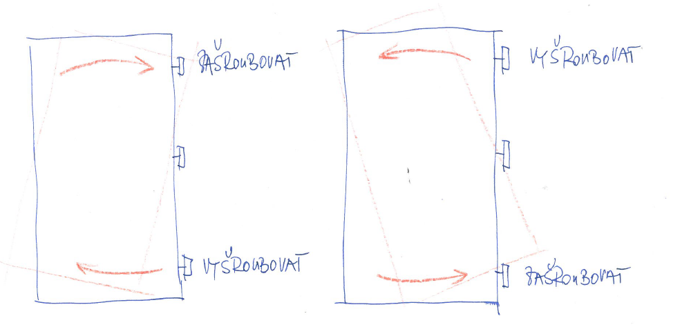Panty na futrech samozřejmě musí mít geometrii. Jinými slovy musí všechny řezat ve svislici nad sebou. Takže vzít sikovky a srovnat. To bude první krok. Pak ještě seřídit mezery po obvodu dveří šroubovacími panty. Jestli drhne vršek dveří nad zámkem, horní pant se zašroubuje, dolní naopak povolí. Tím se celé křídlo nakloní, viz obrázek. Všechny panty musí být seřízené tak, aby žádný netáhl. To znamená že nesmí být mimo pomyslnou přímku která je spojuje. Zaplať pánu Bohu za šroubovací panty. Nechtějte vědět jaký tělocvik jsme s dvěřmu museli vyvádět dokud ještě nebyly.