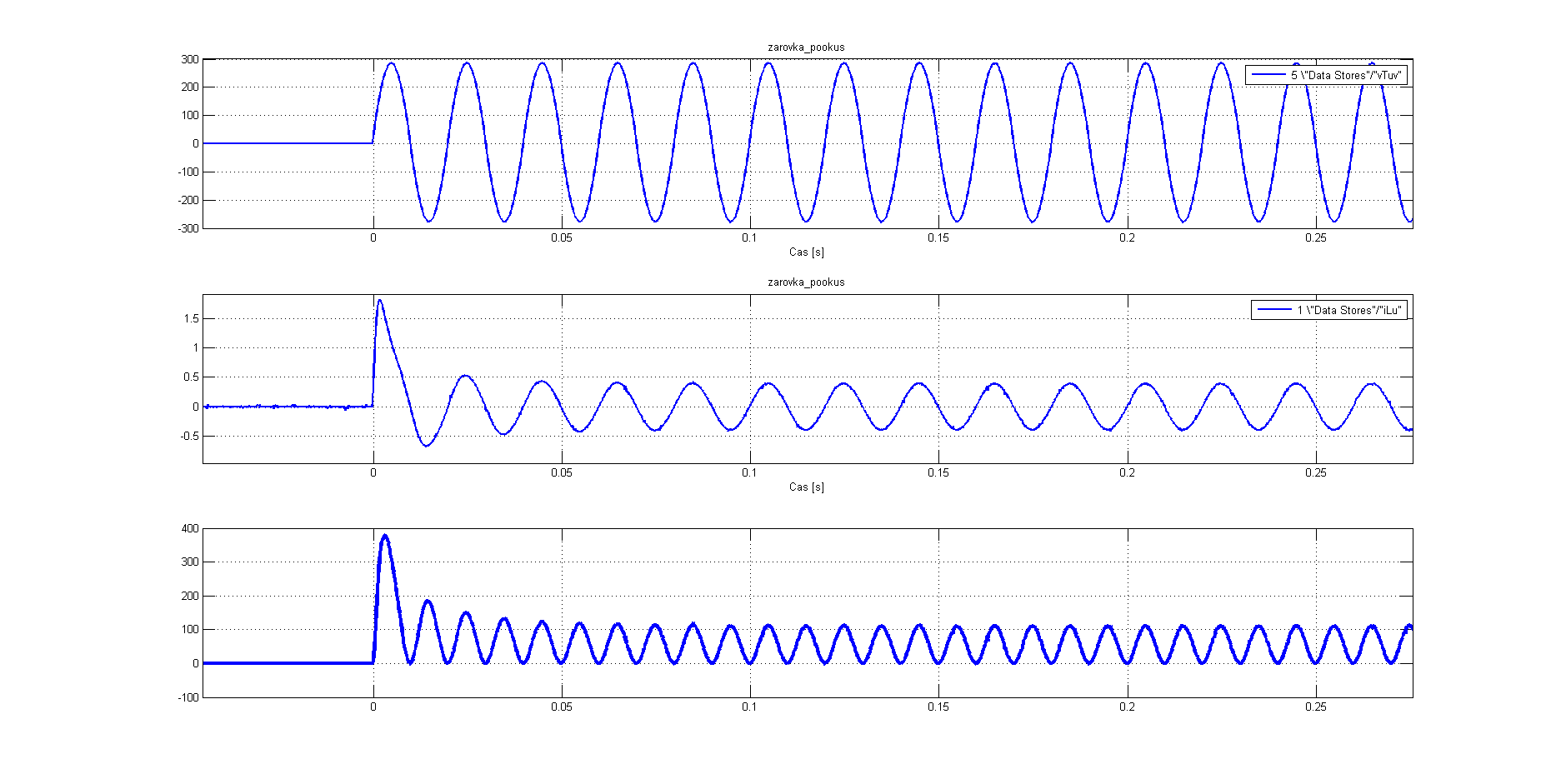 V příloze posílám obrázek toho, jak vypadá napětí a proud ledničky. Do třetího řádku jsem spočítal okamžitý výkon (součin napětí x proud). Je to stará lednička, ale charakter rozběhu by se neměl lišit. Druhý obrázek zachycuje 60W žárovku, na které jsem si aparaturu vyzkoušel (nenechte se zmást špičky výkonu vychází vždy dvojnásobné - cca 120W, střední výkon by měl vyjít 60W), abych netrápil ledničku, když by se mi nepovedlo nastavit záznam. Sepnutí se událo v nule napětí, opět nechci moc trápit lednici více pokusy, okamžik sepnutí můžu nastavit, pro žárovku mám někde celou síť křivek, podobně jsem trápil jeden spínaný zdroj.