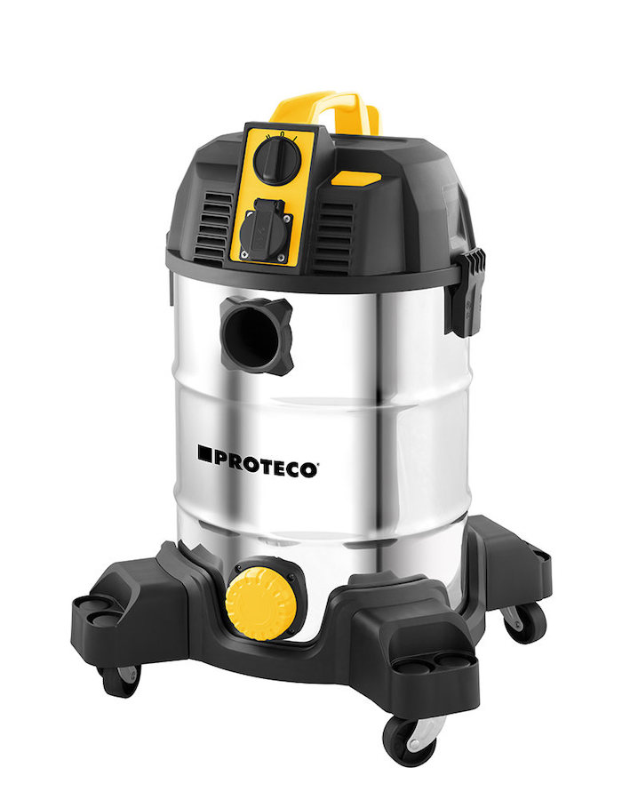 Vysavač průmyslový PROTECO o příkonu 1400W, je určen pro mokré i suché vysávání s použitím vhodného filtru. Vysávat lze běžné nečistoty, prach a vodu. Vysavač je vhodný pro odsávání prachu vznikajícího při práci s ručním elektrickým nářadím, pokud to konstrukce nářadí umožňuje. Komfort zvyšuje automaticky spínaná zásuvka na vysavači. Po zapnutí nářadí dojde automaticky ke spuštění vysavače. Maximální příkon připojovaného elektrického nářadí je 2.000 W. Nerezová nádoba vysavače o objemu 30 l je vybavena uzávěrem pro snadné vypuštění vysáté vody. Pro vysávání vody je vysavač vybaven molitanovým filtrem, prach lze vysávat přímo do nádoby vysavače za použití skládaného filtru, nebo do papírových sáčků. - napájení 220-240V / 50 Hz - příkon 1400 W - automatická zásuvka pro připojení elektrického nářadí do příkonu 2.000W - výfukový otvor s možností připojení hadice - teleskopická sací trubice - kombinovaná a štěrbinová hubice - flexibilní sací hadice, délka 3m - pojezdová kolečka - objem nádoby 30 l