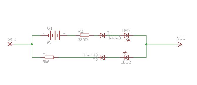 Upravené zapojení pro LED 2mA a baterii 6V [80550-zkousecka2-jpg] EDIT: R2 má být 2k2