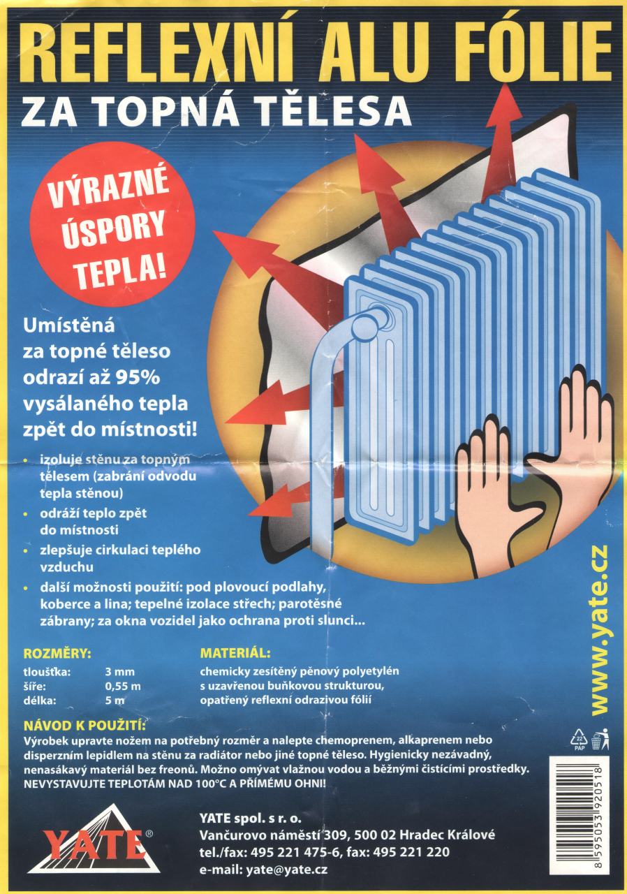 Takže potom sa môže i radiátor (ak sú tam tie regulačné hlavice) nastaviť na nižší stupeň, pretože teplo vyžarované smerom k múru bude odrazené späť (v danom percentuálnom rozsahu) buď na plochu radiátoru, alebo aj mimo neho smerom do miestnosti.