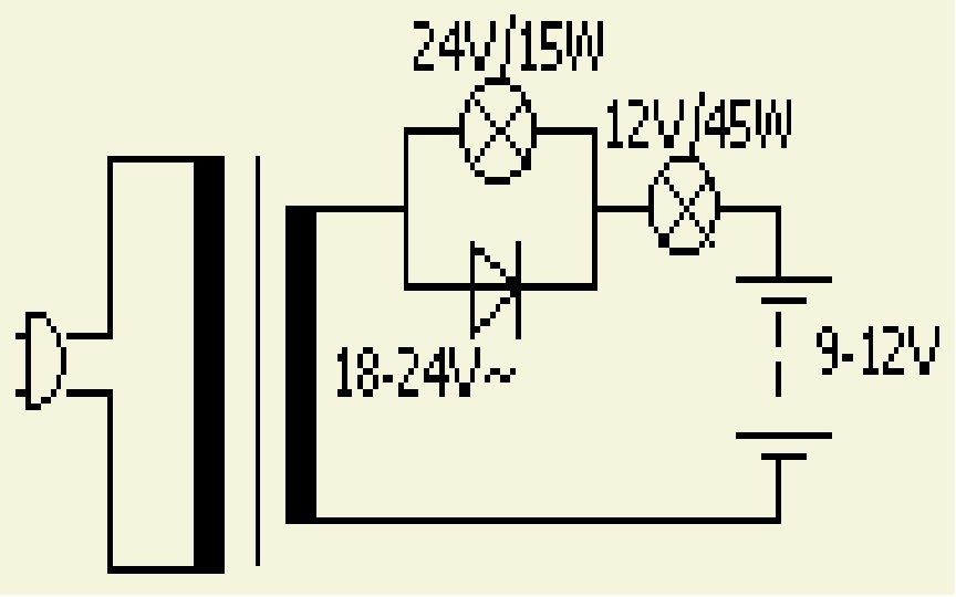 Dôležitý je skratovací okruh napojený paralelene s diódou, čím sa v čase prázdnej polvlny zároveň skratuje baterka vláknom 15W/24V žiarovky.