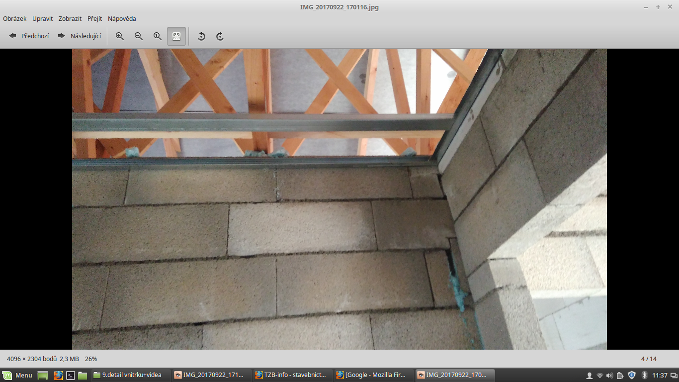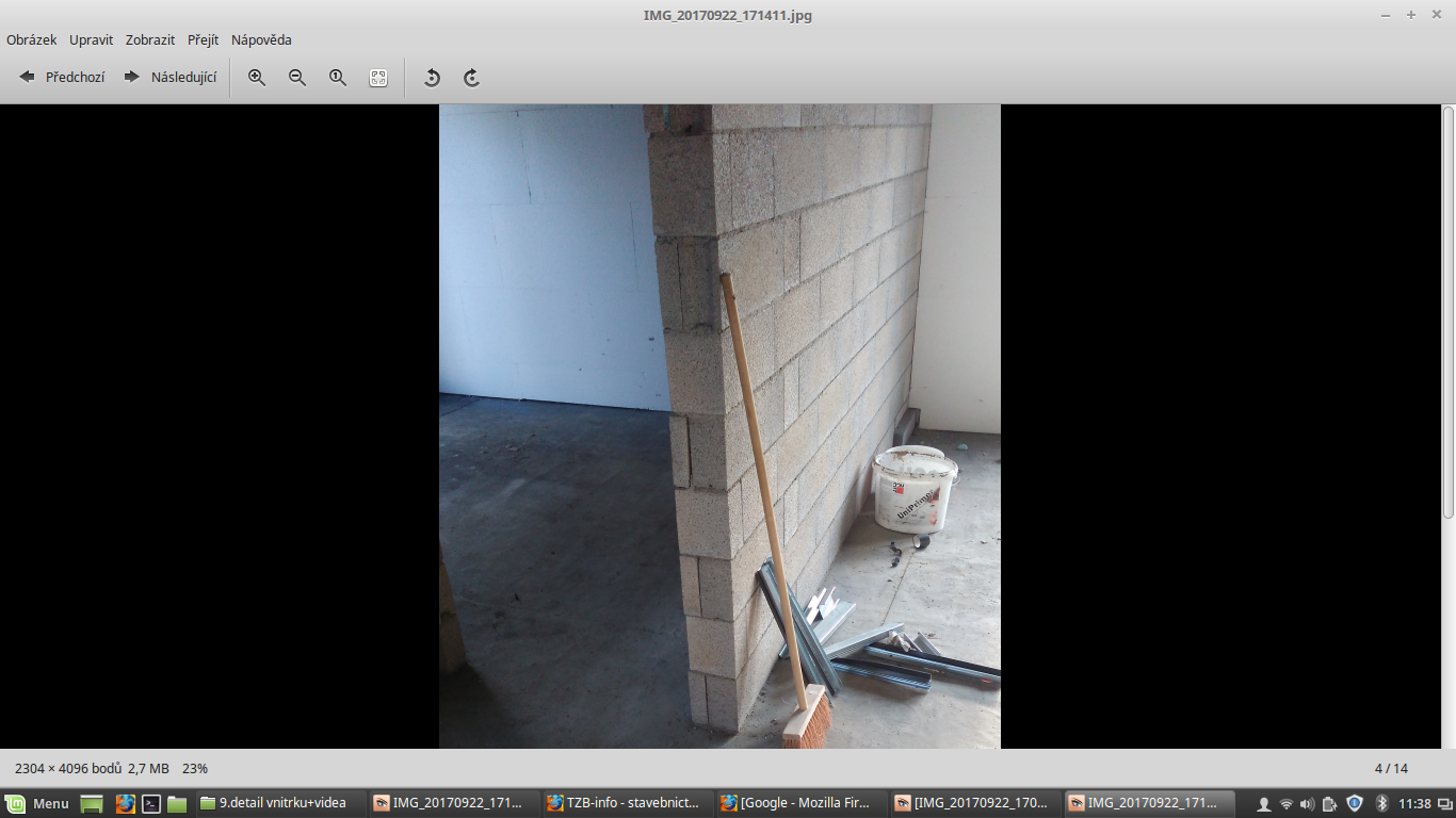 Je zděná na pískovou maltu, žádné ukotvení k podlaze ani ke stropu, jen stojící stěna. Viz foto tvárnice + stěny.