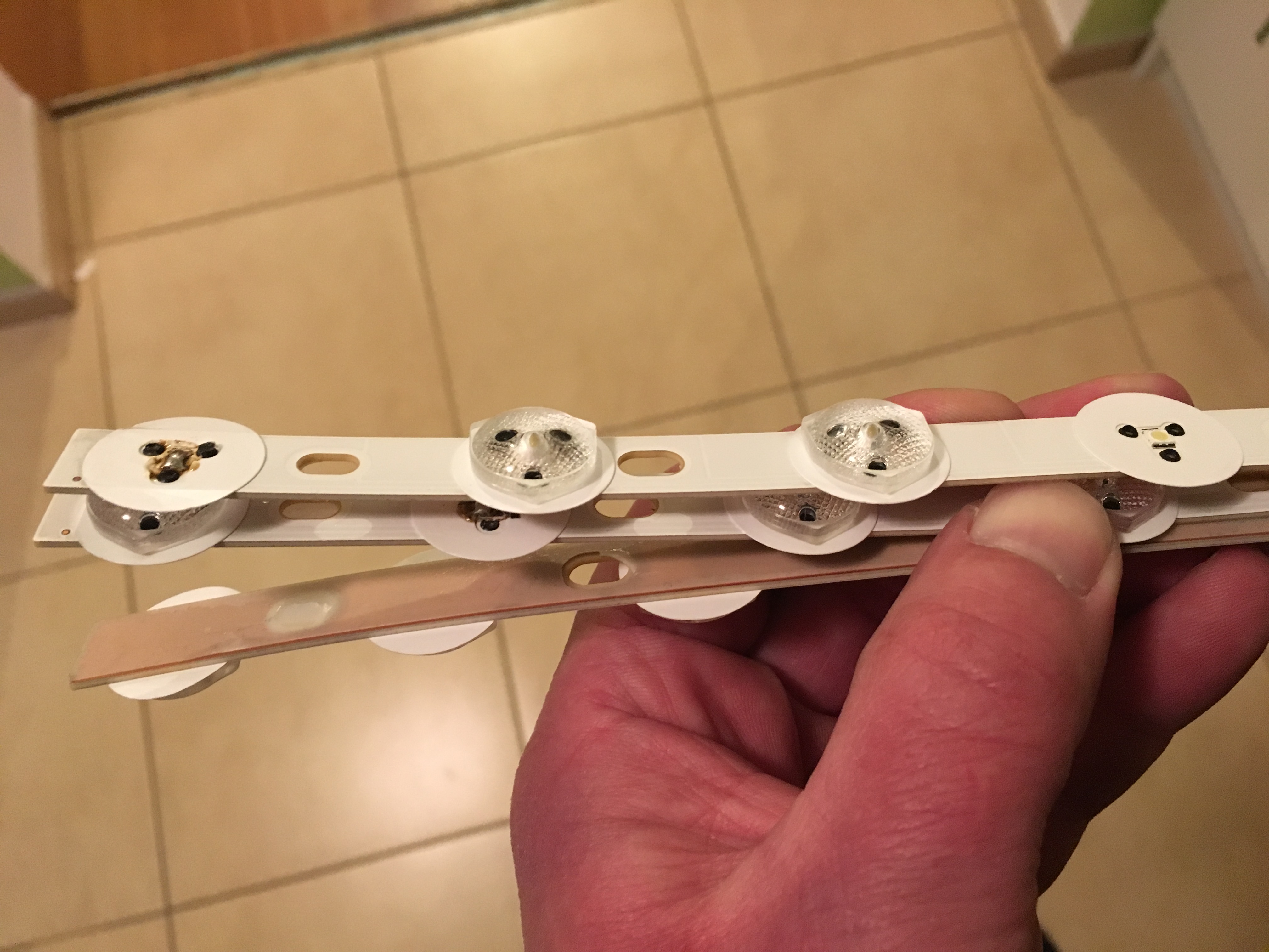 Za ty 4 stovky, jak píše iconek, Ti to nikdo myslim neudělá, jedine hodně dobrý kámo, to bys asi musel sám. Sám bych takoveho rad měl za humny ... Tedy: objednat si z aliexpresu balení řádově 100 ks diod (pro LG objednej typ 3528 2835) v blistru za celkem asi 7 USD, počkat 6 týdnů, nez dorazi, a nahorkovzdusnit je namísto chciplych diod. Je jich tam řádově 50 kousků v TV (podle velikosti TV a uspořádání pásků podsvícení, viz příloha). Vzhledem k tomu, ze rozhodit TV je (alespoň pro mne) docela vopruz, neb je tam X vrstev, nez se dostaneš k podsvícení, doporucuju vymenit rovnou všechny (práce na 20 minut), stejně postupně po záruce maji tendenci postupně vychcipat a budes jich mít v blistru dost