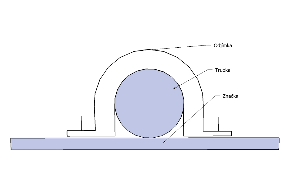 •pásek například šířce 30mm, tloušťce 4mm a délce dle obvodu tyče (takže např) 150mm. Ohnutý do tvaru polokružnice takto s rovným segmentem vyčnívajícím kolmo z konce polokružnice ven, kde je díra na šroub.