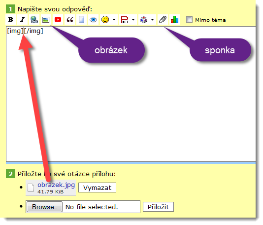 Kliknout na sponku, browse, přiložit. Vložit mezi tagy "obrázek" (img) (/img). Když to bude obří fot…
