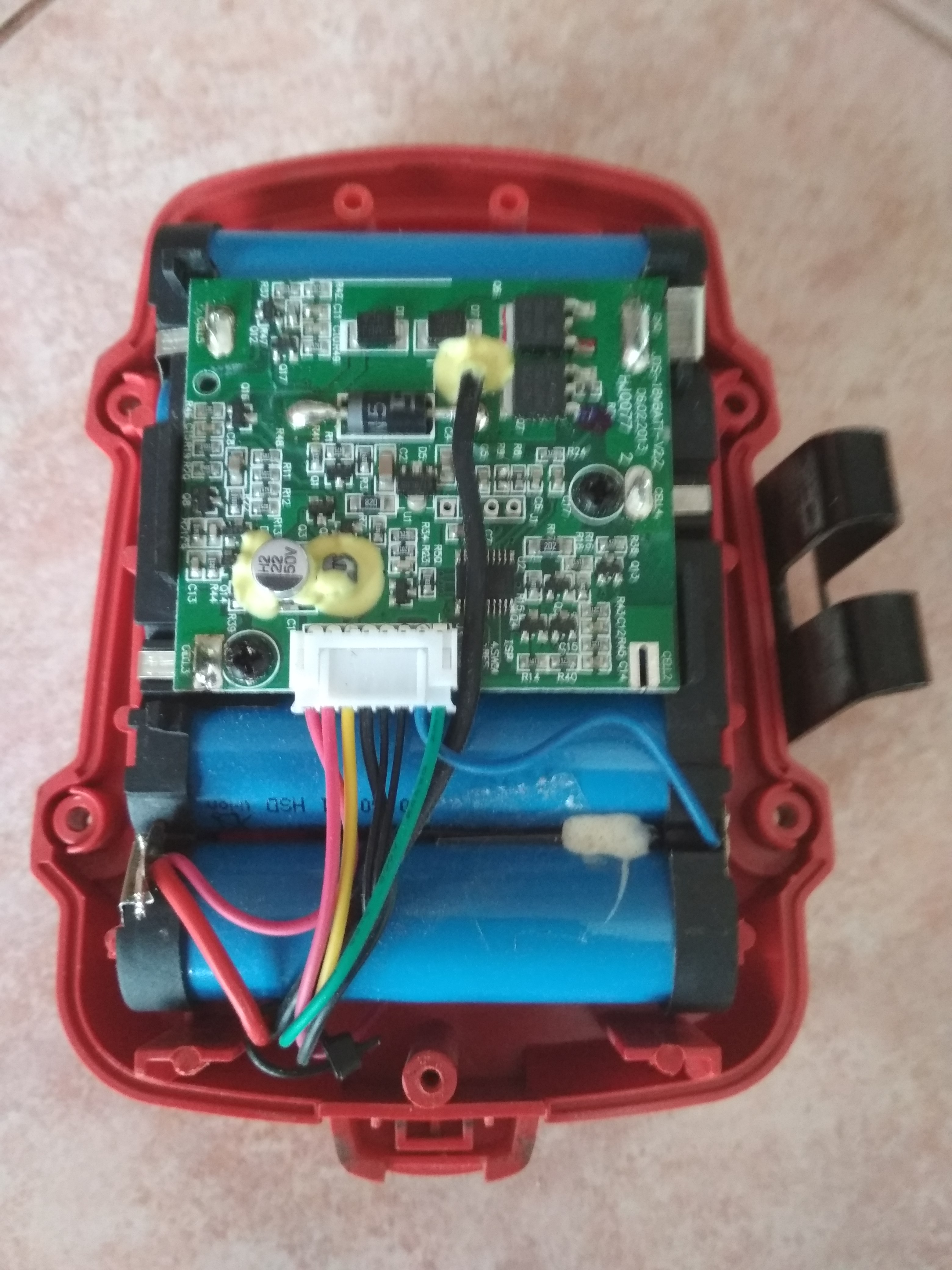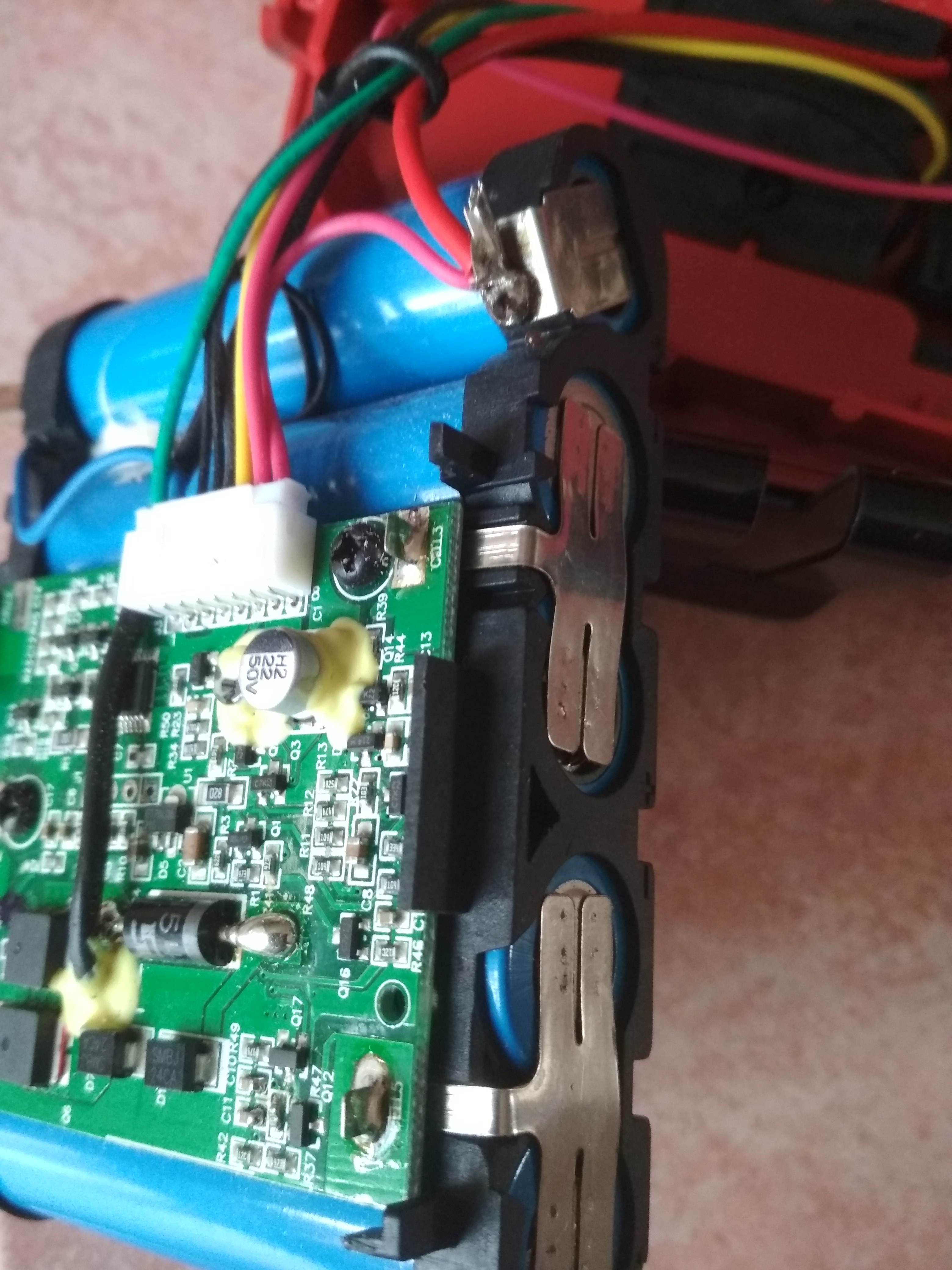 5 baterek v sérii, clánky 2600mAh. Když budeš šikovný, je tam docela dost místa na napájení nových článků. Mezi 2 články je vždy vývod do BMS. Osobně bych ucvaknul plíšek, který vede kolmo od dvou baterek, aby bylo na co pájet a na něj napájel vývody z baterek. Při pájení se snaž zahřívat baterku co nejkratší čas. Naštěstí to na ty kontakty u baterky velmi dobře chytá, není třeba ji nějak dlouho prohřívat.