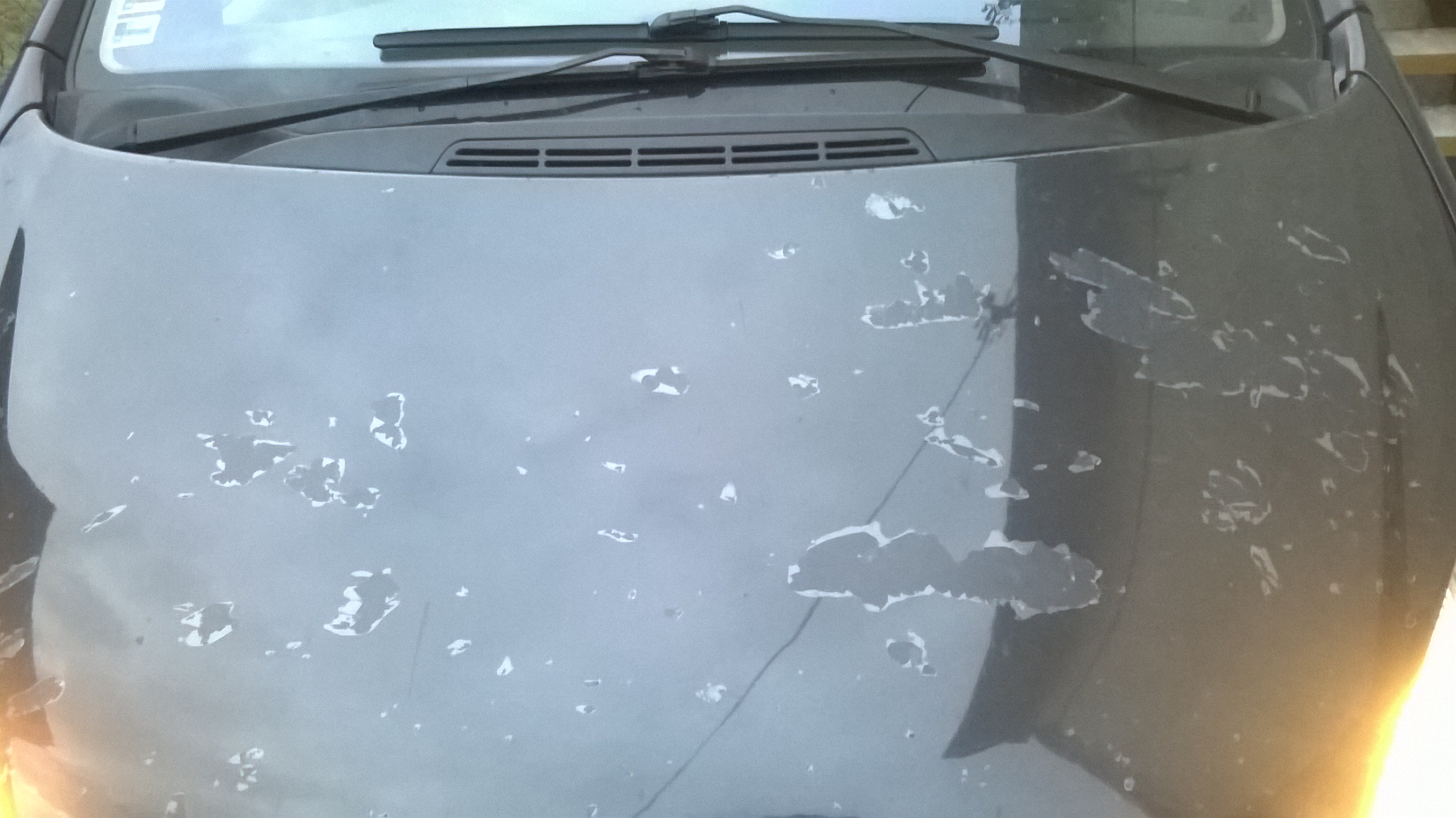 Cely den auto parkovalo na parkovisku, vecer pozeram a neskutocne flaky na kapote + maly flak na lavom blatniku + maly flak na lavych dverach.