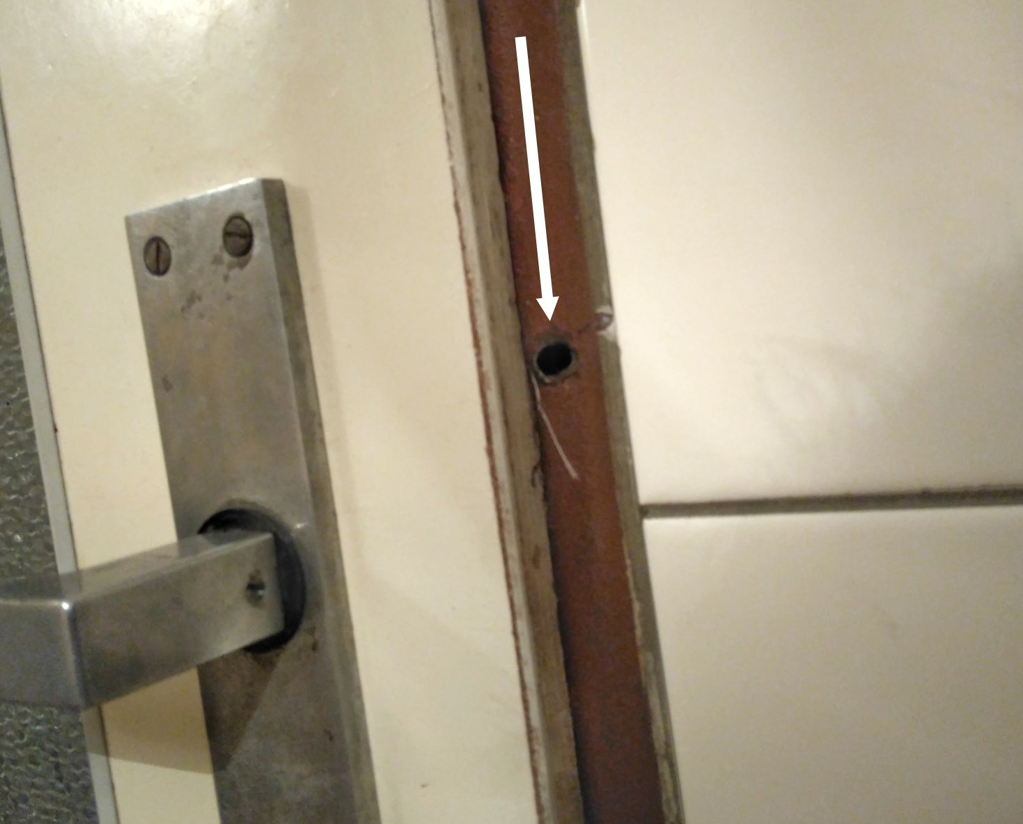 Ze strany kam se dveře otevírají vyvrtat otvor do futer v místě (v ose) této střelky.