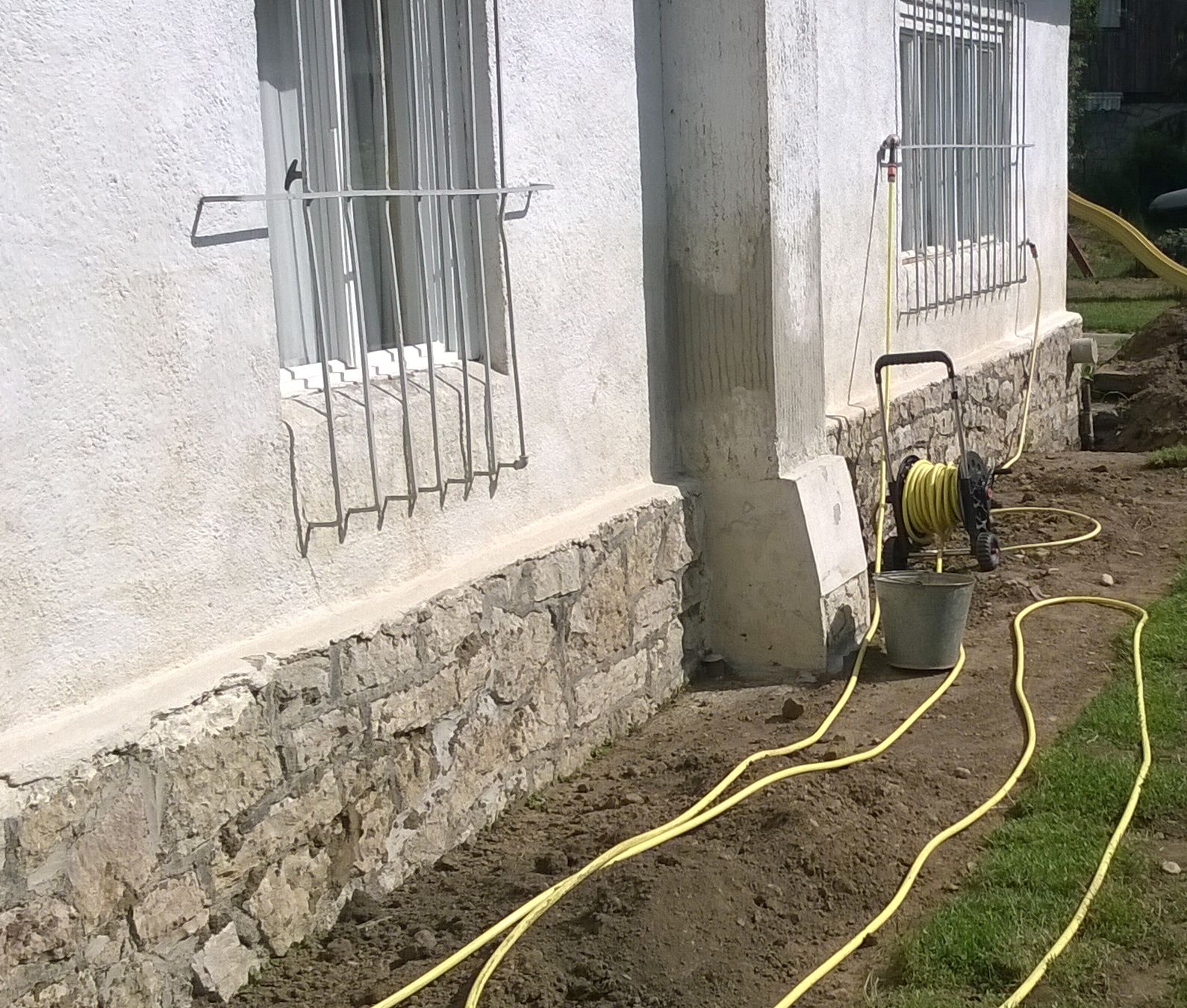 Ale, bolo by vhodné v budúcnosti vykopať tesne okolo chalupy ryhu aspoň 30cm hlboko do pôdy, pred kamenný sokel priložiť do výkopu a tesne pred sokel, až po hranu, na mieru urezanú kari rohož s okami 10x10cm/roxor 0,6mm (armatúra), zašalovať debnenie do výšky sokla, zaliať vzniknutú spáru vibrovaným betónom (drvený kremeň s gritom 0,3mm so silným cementom) s prímesou plastifikátorov (modrý Duvilax).