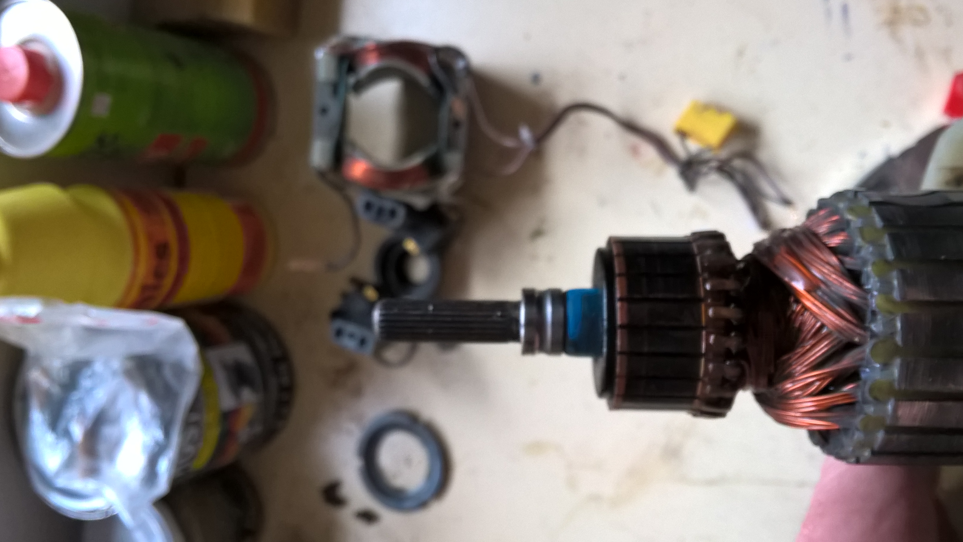 Připrav si malý "dvojpackový" stahovák. Do rozbrušovačky dej nový slabší kotouč. Modrý plastový kroužek obal mokrým hadrem. Pak z obou stran ložiska vybrousíš drážku na packy stahováku a pokud to bude ještě teplé rychle stáhni. Stahovák musíš mít předem nastavený.