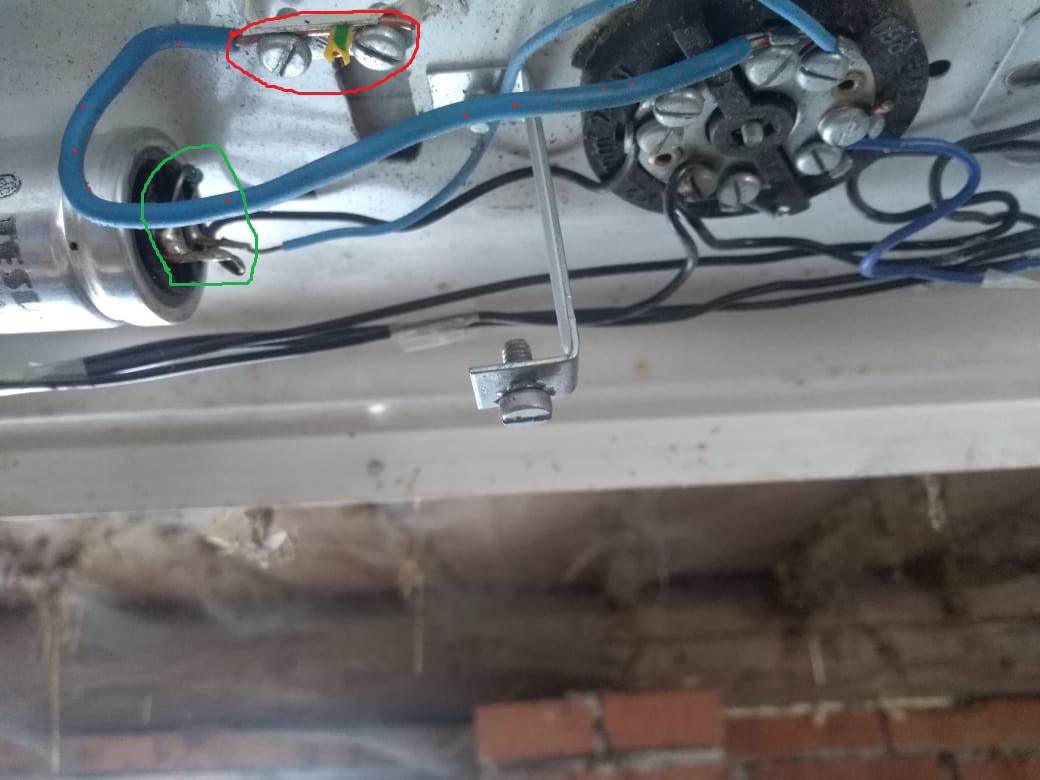 Jde o svítidlo, které bylo v minulosti zapojeno v soustavě TN-C (2 vodiče). Takže byl zapojen vodič z instalace, ŽZ, na svorku ochrany před neb.dotykem "kostry" (to je ten zbyteček) a z ní ten silný modrý na svorku N, pro pracovní nulu "N" svítidla. A fázový vodič z instalace, od vypinače, na druhou svorku L (ten tam už není). Pokud připojuješ na tuto soustavu, tak opět stejně.