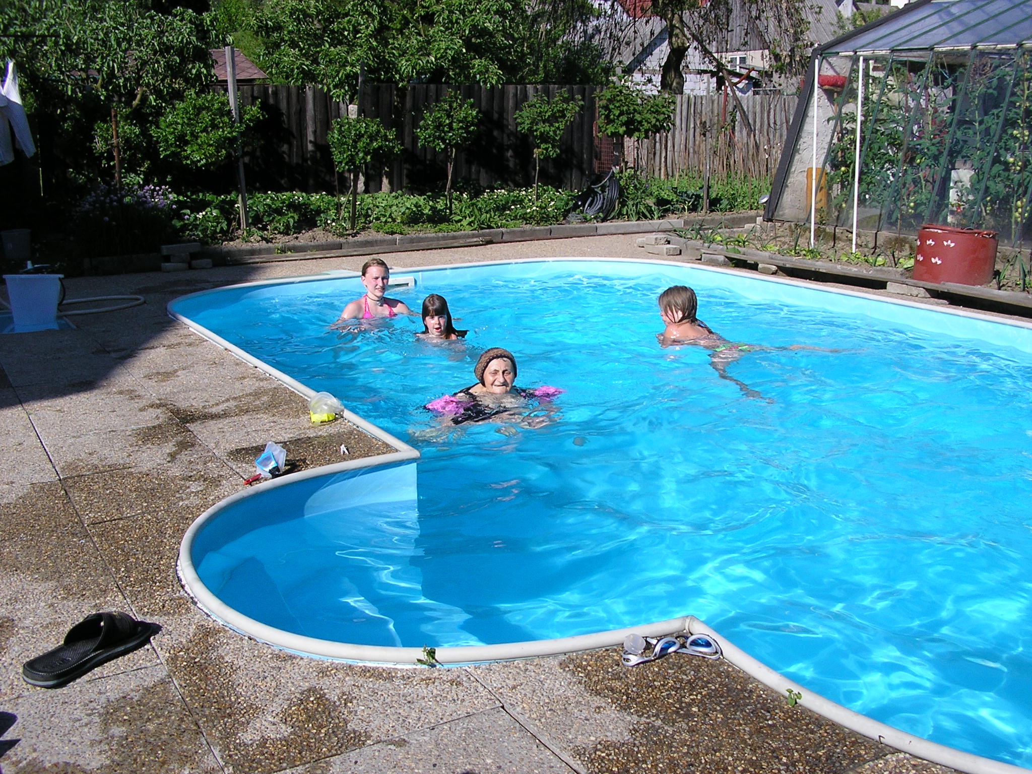 Takže kolem bazénu transparentní silikon a do spár opravené dlažby písek.