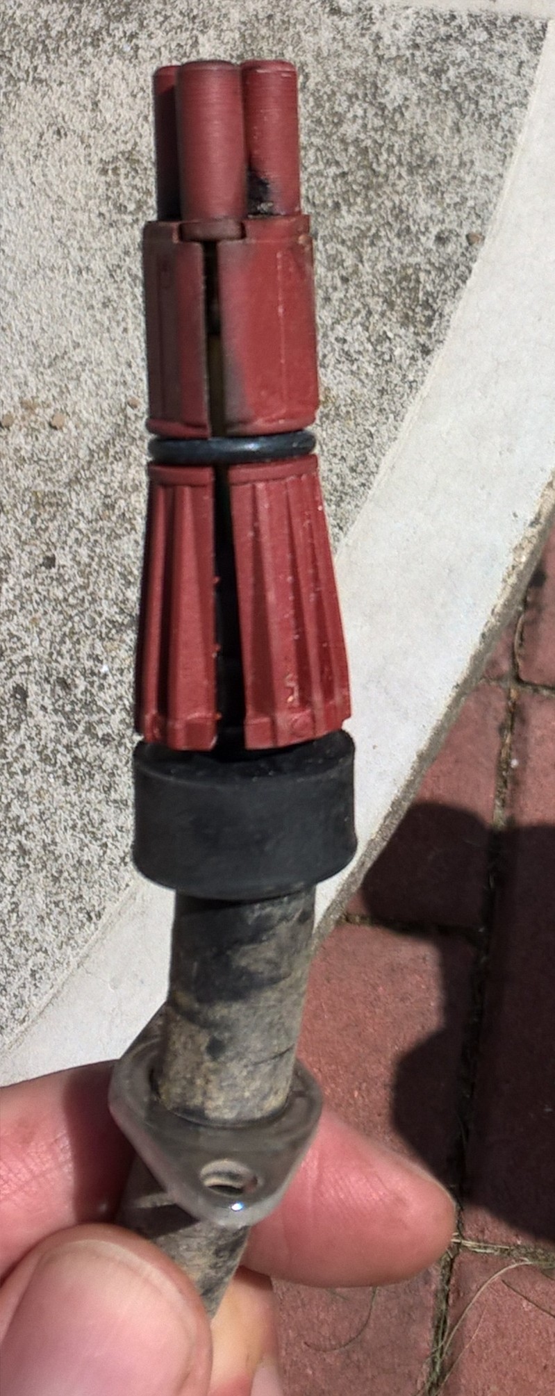 Čerpadlo přestalo jít po předělání výtlačné trubky. Bylo málo vody a tak jsem spouštěl čerpadlo níž. Čerpadlo jsem vůbec neodpojoval, jen vyměnil výtlačnou trubku za delší. Po zapnutí jističe mi začal okamžitě vypadávat proudový chránič. Po vyndání kabelu byl konektor ( viz obrázek) propálený.