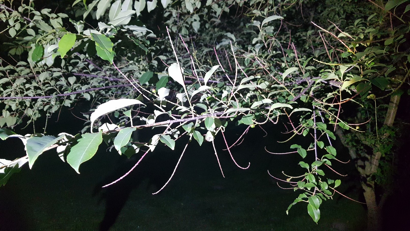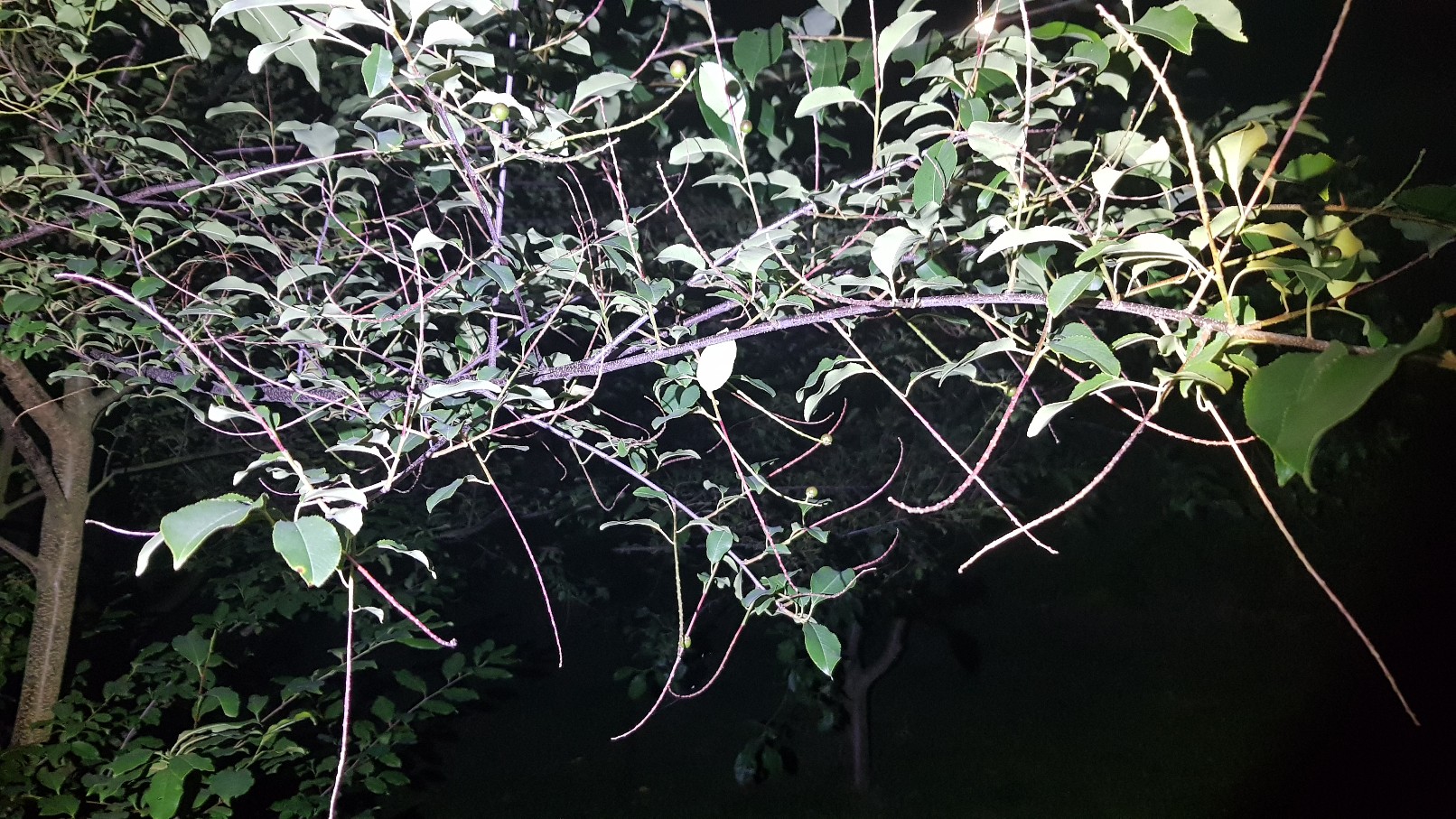 Ahoj nevite prosim podle fotek, co je to za strom? Mam bohuzel jen fotky focene v noci. Ma male cervenozelene bobulky cca 8 mm v prumeru a zvlastne rostle vyhony z vetvi do vsech smeru. moc dekuji za pomoc