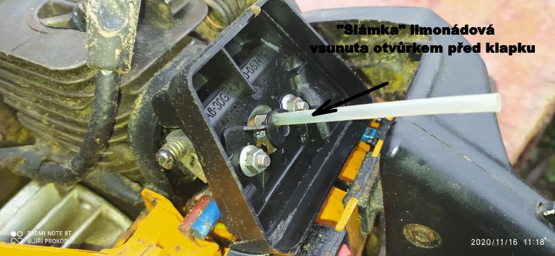 Má čerpací startovací pumpičku a sytičovou klapku. Ať jsem nastavoval regulační šroubky pro nízké otáčky, pro vysoké otáčky i doraz plynu jakkoliv. start se nedařil. Karburátor je ale určitě v pořádku, membrána i ventilky. Svíčka byla vžda suchá, ať jsem čerpal pumpičkou a měl i zavřenou klapku sytiče. Tak jsem vstříkl injekční stříkačkou benzin přímo do difuzeru karburátoru.