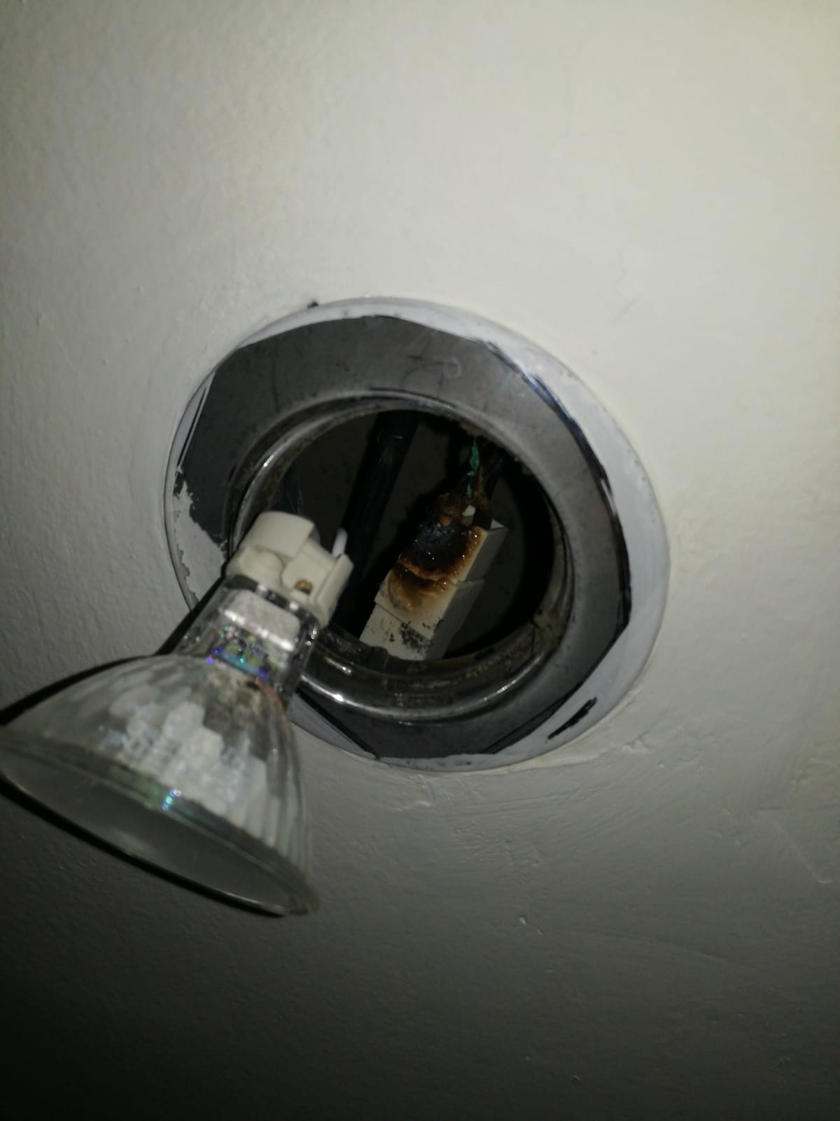 Z podhledu v koupelně z ničeho nic vypadla žárovka. Rovněž vypadl proud. Při ohledání se zjistilo, že objímka žárovky je roztavená. Naštěstí nic nechytlo. Nyní elektrika funguje ze 4 místností v jedné. Stalo se to známým, elektriku v koupelně mají v mědi. Ve 2 pokojích v bytě je ještě v hliníku, předělávají to postupně. Může to souviset?