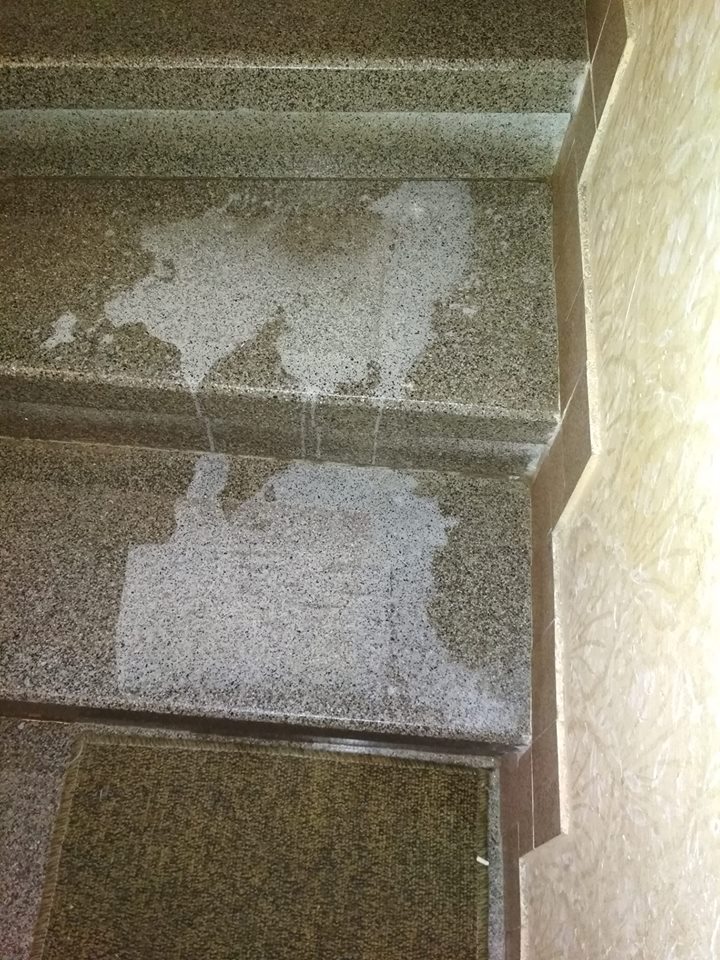 Nepoznáme povrch matroša, možno sa jedná o lepené linoleum na schodoch, ktoré je iba zašlapené "zarastenou" špinou a v mieste čistenia octom "prokouklo".