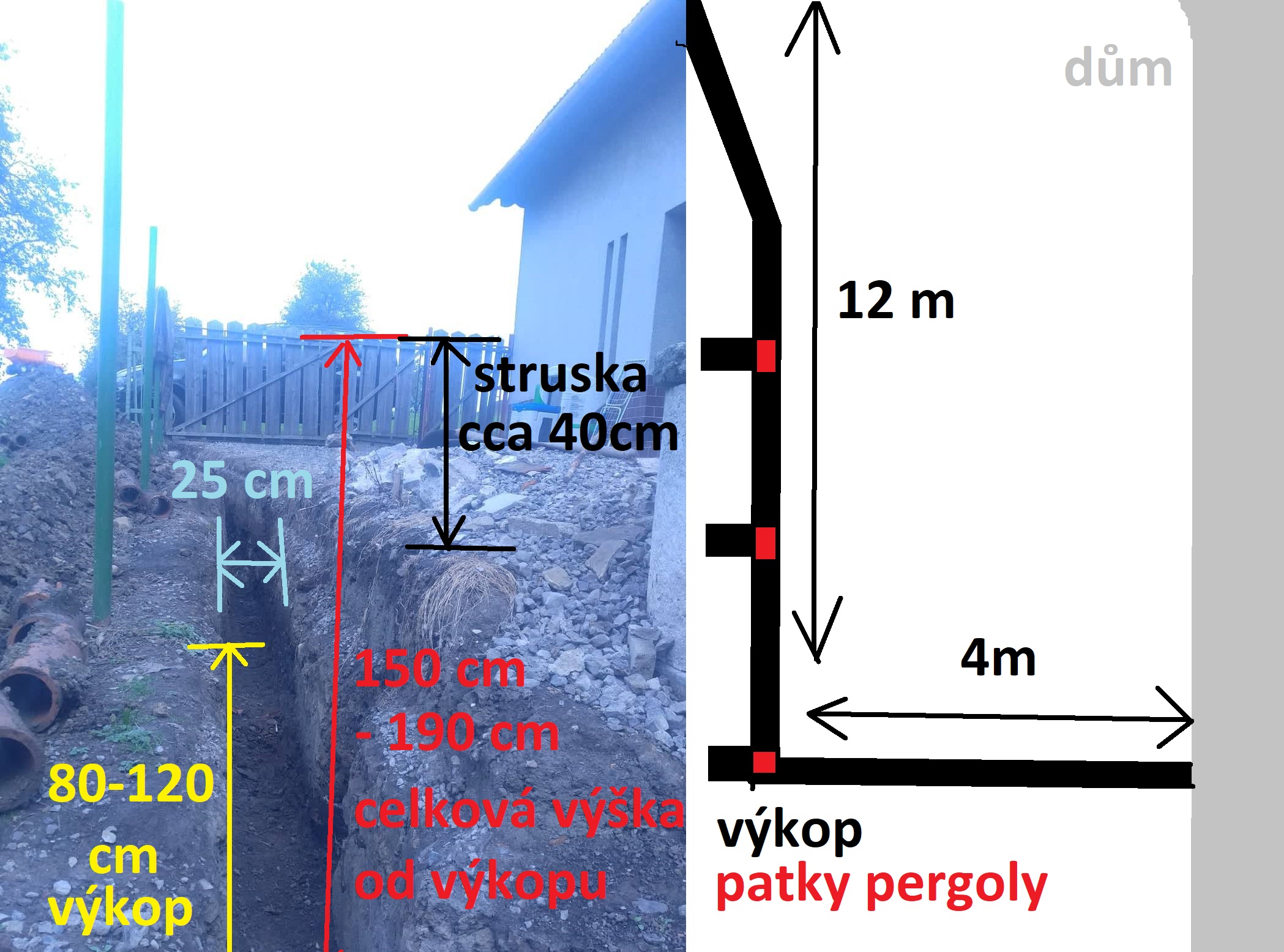 Výkop jsem rozšířil na 30cm široký základ , vysoký 80 cm. To vychází na 3 řady ZB 20citek. Do toho ZB bych chtěl dát ocelové patky na pergolu. Myslíte že to nevydrží? Do zakladu co metr vertikálně roxory, ať vycházejí přes první řadu ZB, pak je prodloužit a bednění také pořádně provázat jak vertikálně, tak horizontálně a nahoru dát patky. Pokud bych pergolu nedělal, tak vím že by zídka vydržela, ale kvůli místa, špatně vycházející patky vůči dveřím, oknum u domu a blízko sousedícího pozemku nemůžu dát patky mimo vycházející základ. Do základu jsem ještě v místech kde mají být patky kopnul odbočku vně základ , ať to bude jako zakopané "hrabě". Je to lepší pro stabilitu základů co jsem se dočetl.