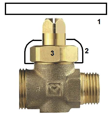 Otáčecí kolečko 1 sundat, bakelitovou krytku 2 sundat a převlečnou matici 3 OPATRNĚ povolovat. Pod kohout dát nějaký kastrol, začne odkapávat voda, asi dost špinavá. A zkoušet, jestli se dá kohoutem pootočit. Pak namazat hřídelku co prochází dírou v převlečné matici a matici zase utáhnout, aby voda přestala odkapávat.