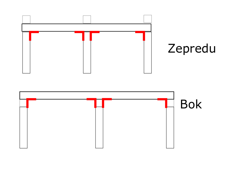 Jinak, je možno a bylo by i jednodušší a lepší, jak píše Kecal, ty tři podpěry spojit z boků, ale i na čelech, širšími prkny cca 15-20 cm, třeba i přímo u vrchu, a ta přišroubovat silnějšími vruty do noh těch podpěr a tím by byla celá konstrukce dostatečně stabilní. A mohly by na nich končit a opírat se i ta vrchní prkna (nebo třeba OSB deska), na kterou by přišly matrace.