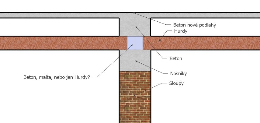 psal jsem že hurdy jsou uloženy na železobetonových překladech (pro ty co nevědí co je překlad přikládám fotku), to že správná skladba má vypadat úplně jinak a že je hurda jen bednění samozřejmě vím. Bohužel před 80 lety asi někdo dům stavěl z toho co měl a tak nebyl dodržen správný postup. Tedy žádné Ička, žádné originál nosníky, ale normální překlady a na nich vedle sebe poskládané hurdy. Kdybych měl Ička nepsal bych sem a držel bych se předepsaného postupu, já potřebuji zjistit, jakým způsobem vytvořit nosnou podlahu v tomhle případě a jak se po podlaze pohybovat při rekonstrukci, když nemám nosnou část, kterou bych měl, kdyby byly použity Ička. Ve sklepě jsou nosné sloupy cca 2,5 metru od sebe, které budu v polovině ještě dozdívat, takže budou do 130 cm od sebe, což si myslím že je dost nahusto. Těžko budu nyní předělávat skladbu stropu dle přesně daného postupu. Když strop vydržel 80 let mělo by to vydržet dalších 50 bez problému, jenom potřebuji zjistit, zda těch 6 cm betonu s karisítí bude dostačovat a jestli to hurdy vydrží, když beton bude vlastně přímo na nich.