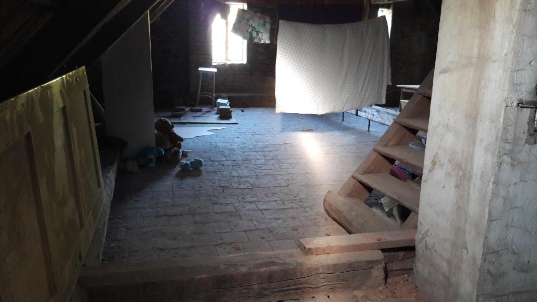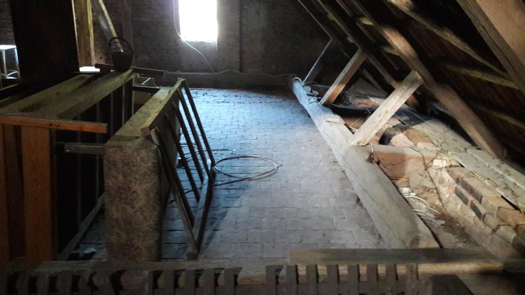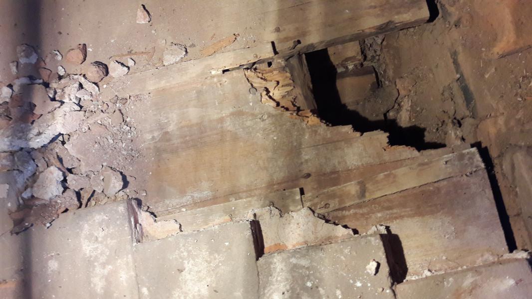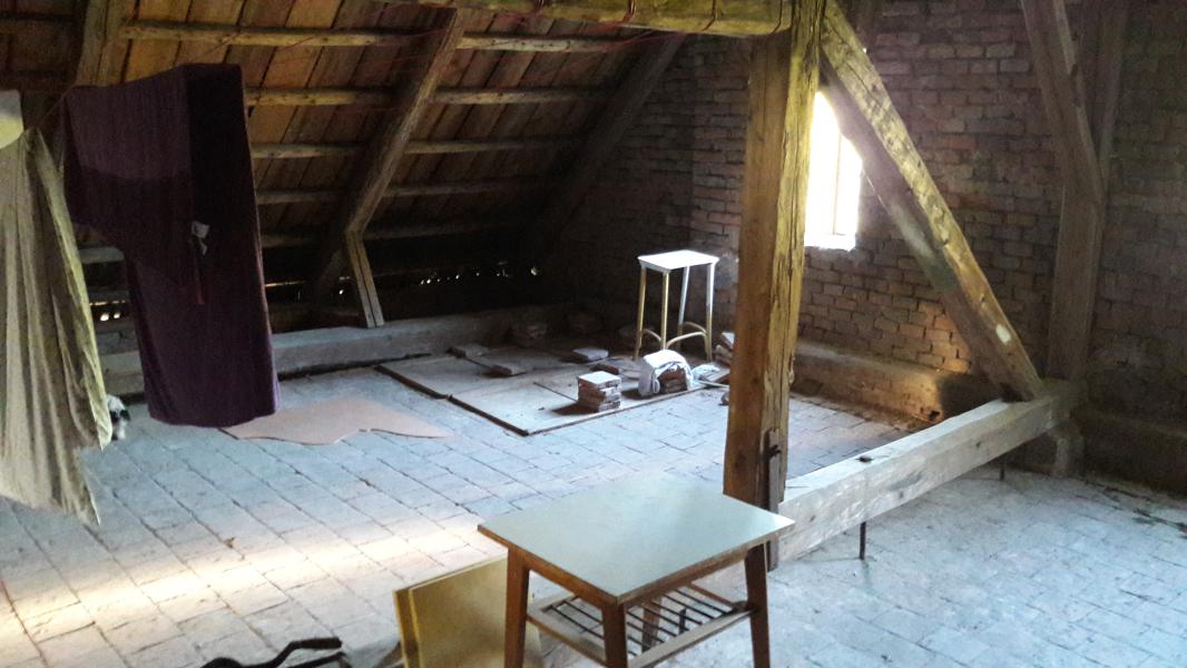 Z vrchu, je složení: půdovky, vrstvička malty, prkený překlad, nosný trám, prkený záklop a na tom zřejmě rákos a nahozeno, to už jsme na stropě místností dole.