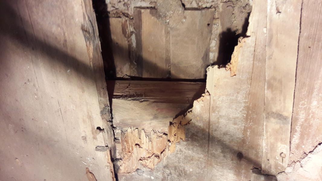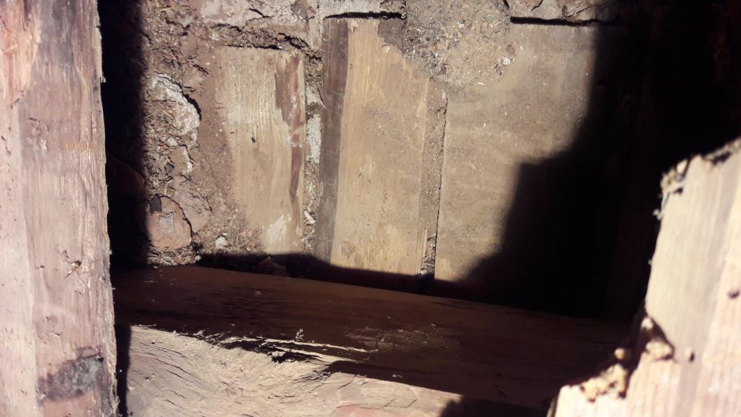 Prkna i trámy vypadají dobře, v mezeře mezi prkny, která je na výšku trámu je jen vzduchová mezera, žádná izolace aspoň v tomto místě, žádná škvára, jen prach smíchaný se dřevem a možná zbytky jakési izolace (spíš bordelu).