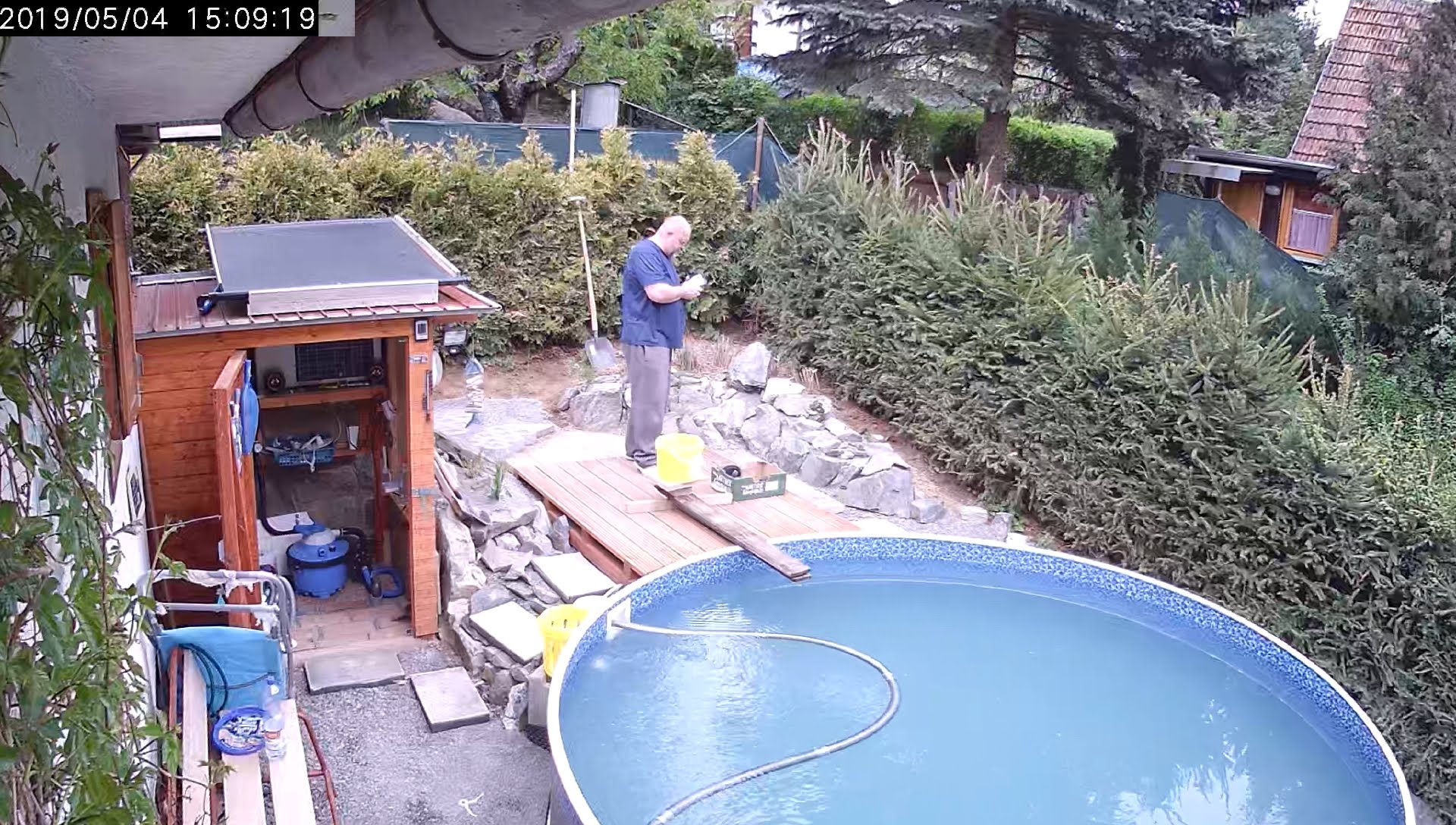 Tak mám hotovou novou "budku" na filtr a čerpadlo. Vzhledem k dřívějšímu řešení jsem ji udělal trochu větší. Rozměry: š.:85 cm, hl.:70 cm, v.: 95 cm. Bočnice z modřínových palubek, víko z desky cetris 10 mm. V prostoru budky uloženy rovněž potřebné "propriety" (chlor šok, patáky, nádobky a pod.) Přikládám tedy i fotky. Na prvních postup montáže, pak celkové pohledy a pohled dovnitř (ovládání-spínání čerpadla). Za budkou, na staré konstrukci, 2 kolektory. Dnes už teplota vody 27 st.C. Práce cca 15 hodin. Já to dělal už naposled, mě to už přežije.:-D:puff: