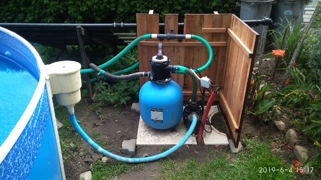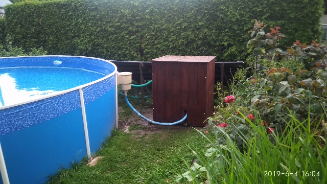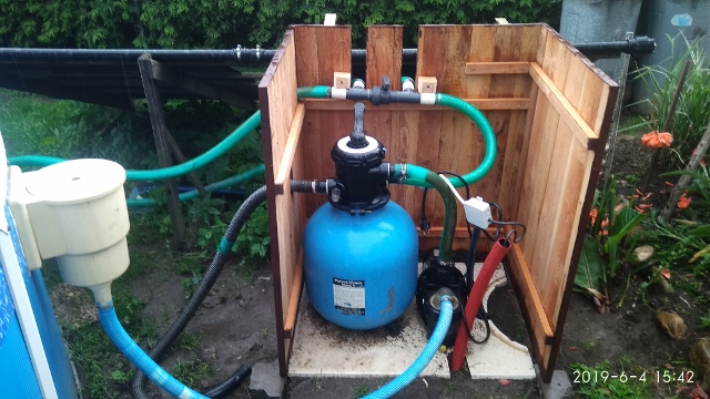 Dřevěná, rozebíratelná bedna z prkýnek, ze sešroubených čtyř bočnic (8 vrutů), o vhodném rozměru podle rozměrů filtru a čerpadla (já mám cca 70*70*70 cm), shora uzavřená plochým víkem s mírně šikmým povrchem, krytým proti dešti (PVC, polykarbonát a pod.) na pantech (může sloužit i jako odkládací stolek). Vhodný nátěr proti povětrnostním vlivům. Vývody hadicemi přes boky. Pokud nutno, možno snadno demontovat a na zimu uložit.
