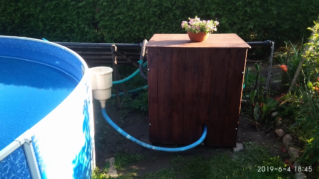 Tak mám hotovou novou "budku" na filtr a čerpadlo. Vzhledem k dřívějšímu řešení jsem ji udělal trochu větší. Rozměry: š.:85 cm, hl.:70 cm, v.: 95 cm. Bočnice z modřínových palubek, víko z desky cetris 10 mm. V prostoru budky uloženy rovněž potřebné "propriety" (chlor šok, patáky, nádobky a pod.) Přikládám tedy i fotky. Na prvních postup montáže, pak celkové pohledy a pohled dovnitř (ovládání-spínání čerpadla). Za budkou, na staré konstrukci, 2 kolektory. Dnes už teplota vody 27 st.C. Práce cca 15 hodin. Já to dělal už naposled, mě to už přežije.
