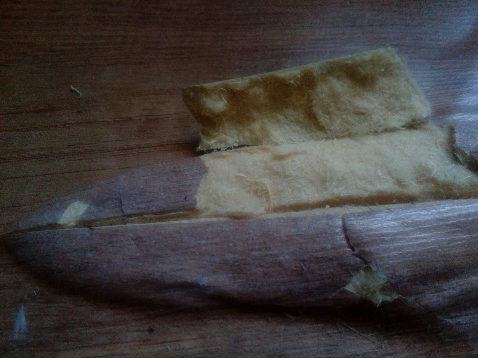 Těžko říct - takhle se chová nachcaná mdf nebo hdf, takže nějaká laciná "plovoučka", ale tomu zase neodpovídají ty "chlupy"… Řekl bych, že dneska už se to sehnat nedá, takže jedna z variant je to vytrhat a udělat komplet nové…
