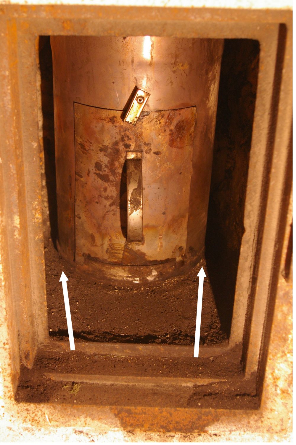 Roura je vložena do starého cihlového kominu, který byl průměrově větší tak že kolem roury je relativně dost prostoru