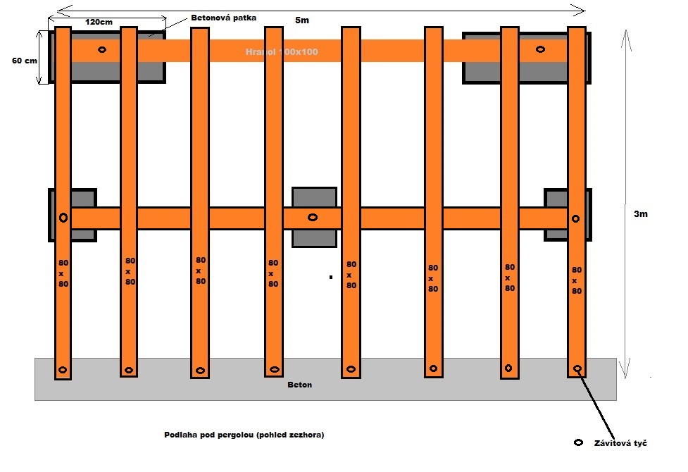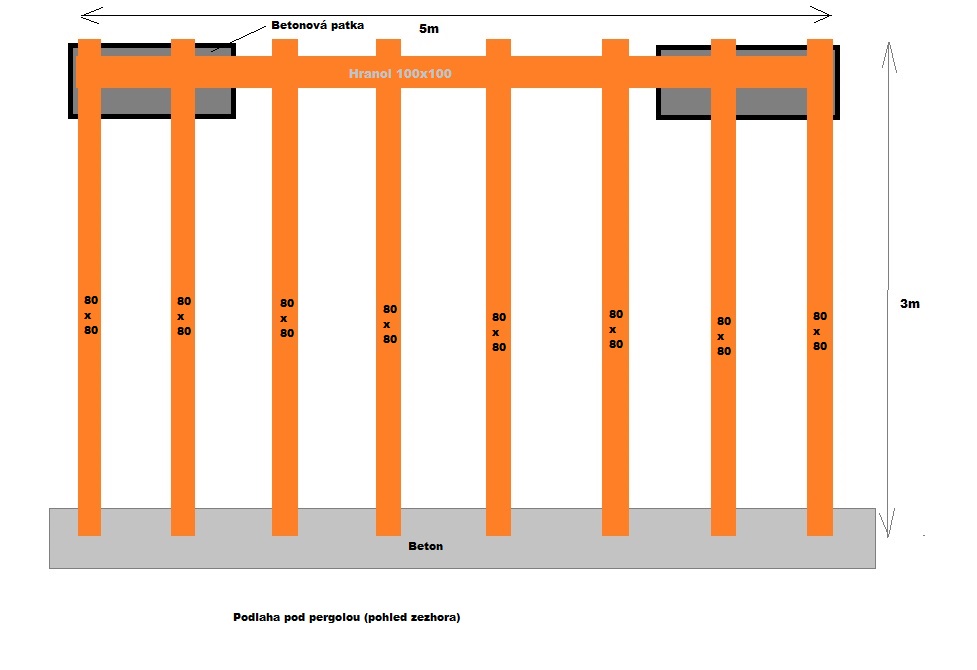 Dobrý den, chci na zahradě udělat pergolu. Myslíte že můžu použít takovéto rozestavení hranolů na podlahu. Viz obr. Nebude se to prohýbat na ty 3 metry? Nechci dělat uprostřed ještě patky. Děkuji