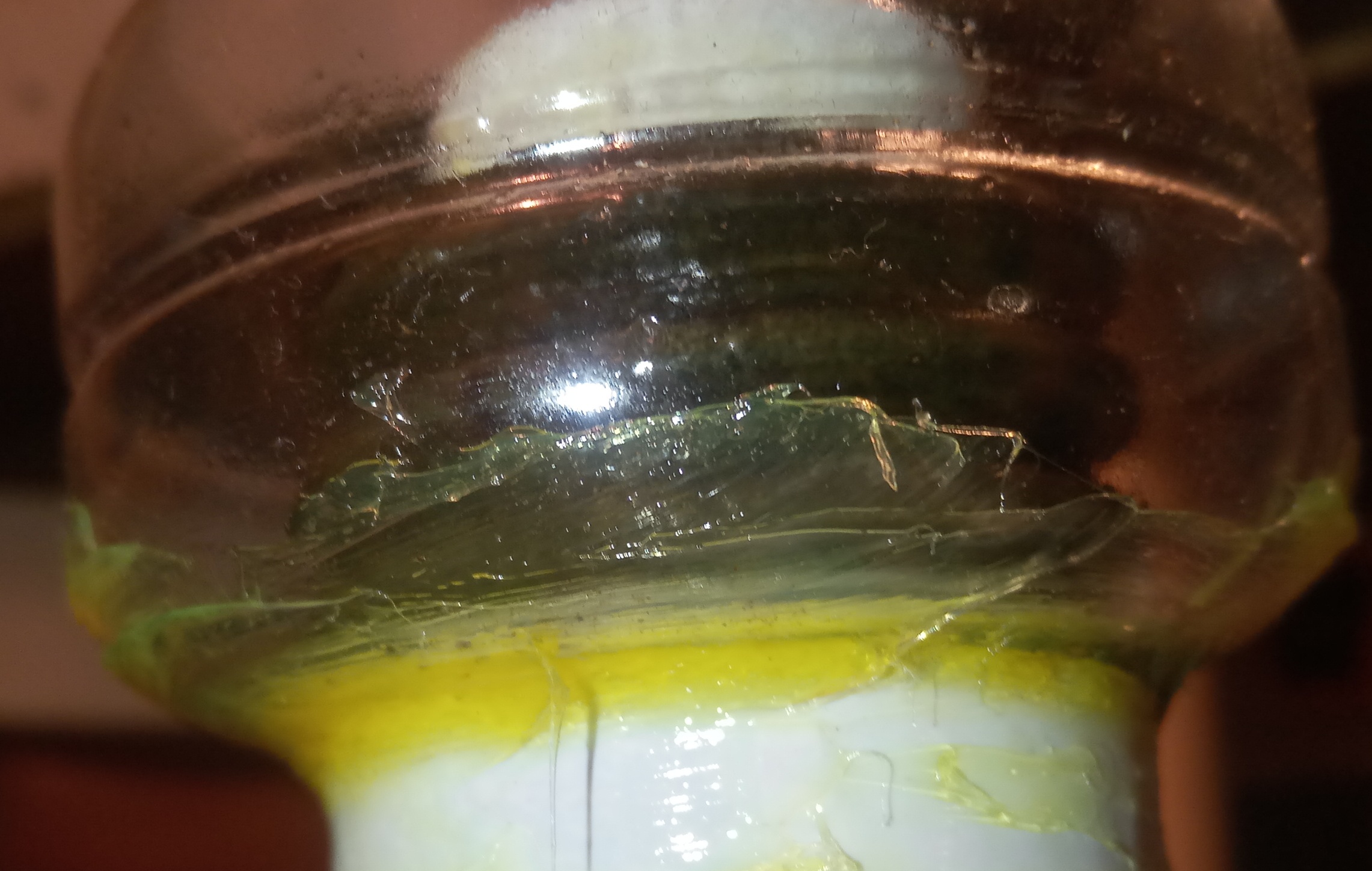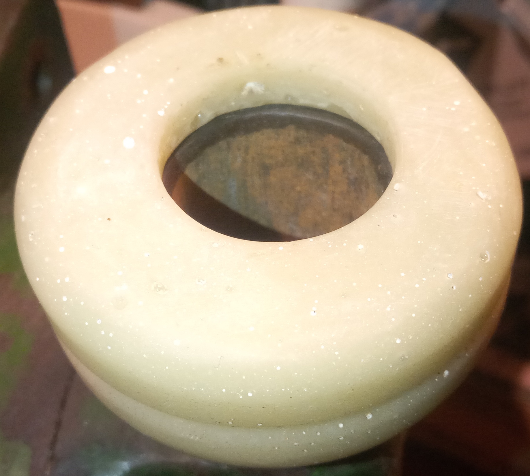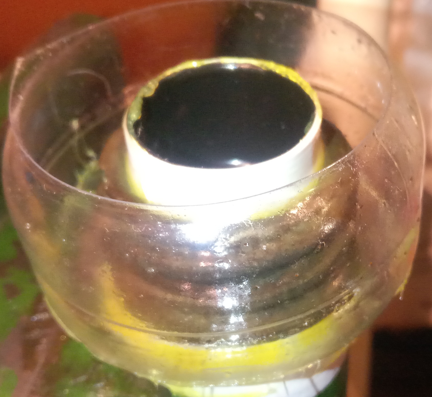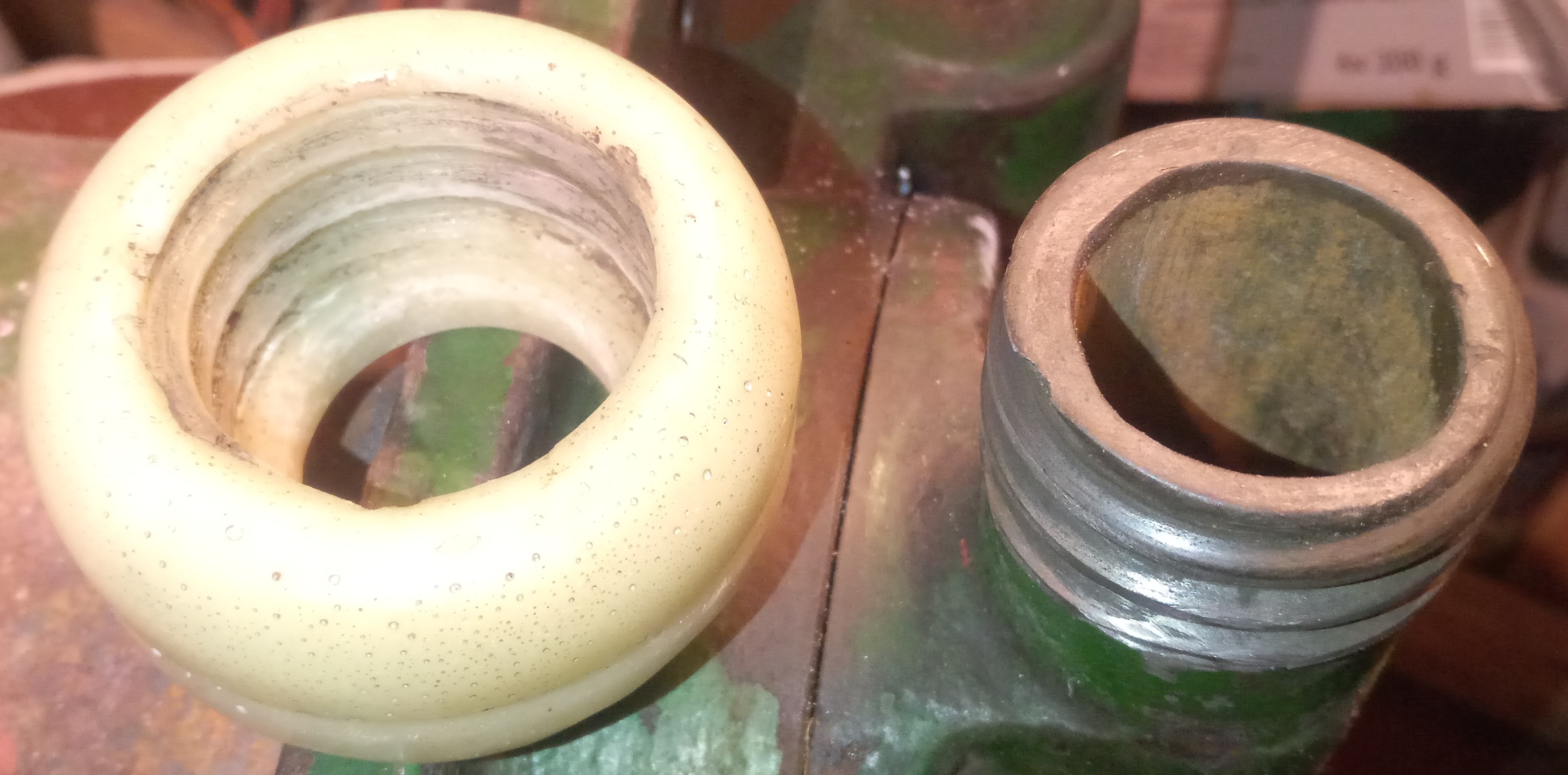 Hodně jednoduše udělané. Uřezal jsem dno od jedlého oleje. Do něho udělal díru a našrouboval to na ten závit, do té díry jsem vložil víčko od spreje a utěsnil to obyč vazelínou, kterou jsem použil i jako separátor a na to ještě silikonový olej ve spreji. Samozřejmě by to bylo lepší nějak ve vakuu odsát ten vzduch, ale bylo by to o dost složitější. Taky to přineslo sebou jeden zádrhel. A sice, že ten prastarý závit je nepravidelný a odlitek na něm je z nutnosti velmi přesný a bez vůlí. Takže byl problém trošku tu matici sešroubovat dolů. Měl jsem ten závit napřed omotat třeba izolačkou, aby ta vůle pak byla vymezena. Nakonec jsem to trošku celé obrousil. Je ta matice kulatá a hladká a nepohodlná na úchop, ale to už je drobnůstka to případně dořešit. Účel plnit bude krásně.